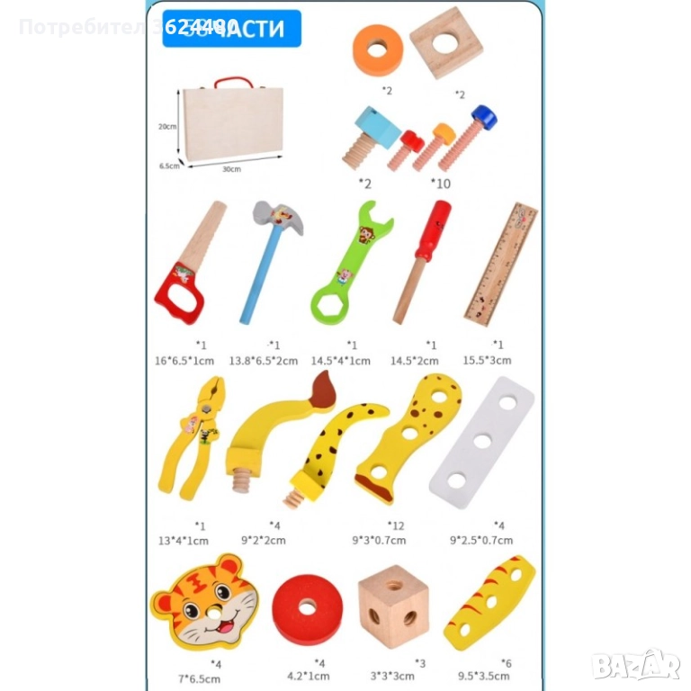 Дървено куфарче с дървени инструменти, болтове, части за животни - общо 52 части