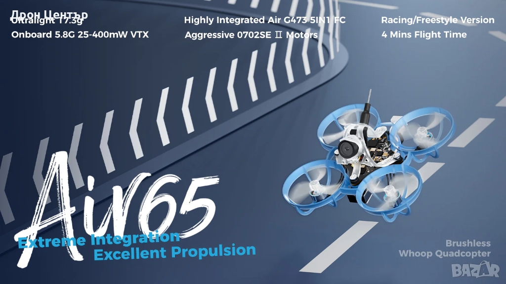 Захранван от надградените безчеткови мотори 0702SE II, Air65 издига задвижването и производителността до нови висоти Независимо дали става въпрос за Racing или Freestyle версията, Air65 е проектиран да поддържа изключителна пъргавина и прецизност, идеално пригоден да завладява състезателни трасета или фрийстайл полети с лекота