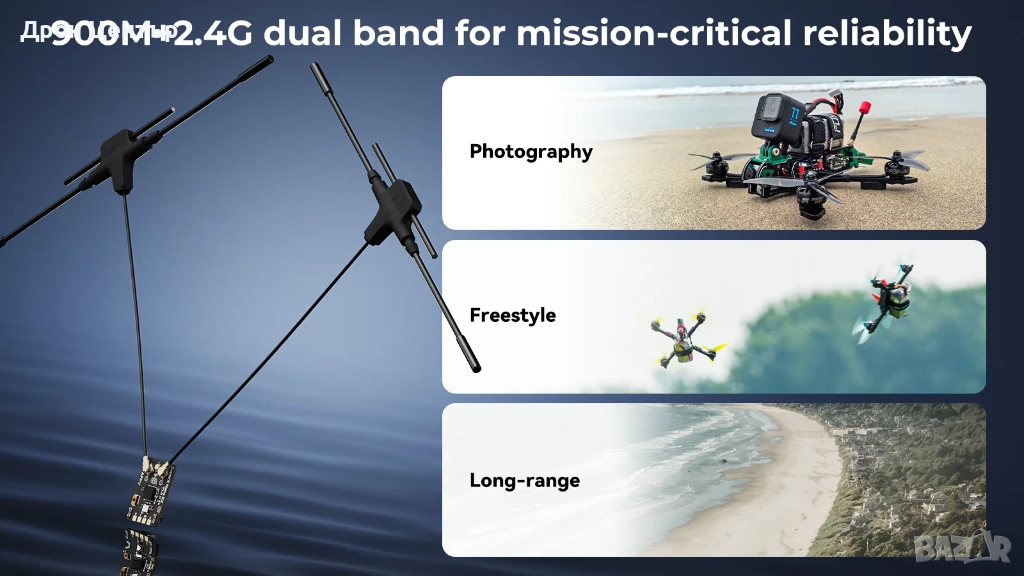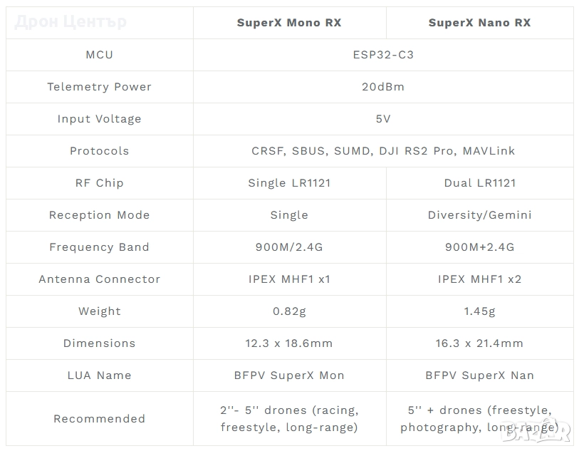 Захранван от двойни LR1121 чипове от Semtech, SuperX Nano Receiver осигурява безкомпромисна надеждност на сигнала с три режима: 900M Gemini (проникване на дълги разстояния), 2.4G Gemini (ултра-ниска латентност) и 900M+2.4G GemX (едновременна работа). Включените двулентови T антени елиминират затрудненията при превключване на честотите, докато усъвършенстваната diversity обработка гарантира непоклатима стабилност в среди с предизвикателни радиочестотни условия. Създаден за мисии с критично значение, той е върховното решение за състезатели, изследователи на дълги разстояния и професионални въздушни фотографи, които изискват нулева компромисна производителност.