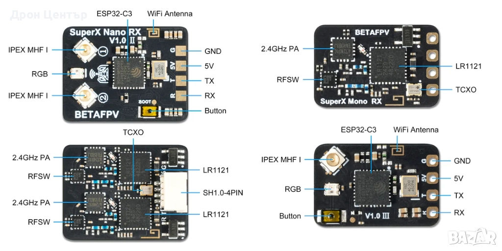Захранван от RF чиповете LR1121 на Semtech и ESP32-C3 на Espressif, SuperX е първият Gemini Xrossband приемник на BETAFPV – овладяващ 900M (868/915MHz) и 2.4G честотни ленти чрез LoRa и светкавично бързи 1000Hz FSK режими Покорявайте състезателни трасета и хоризонти на дълги разстояния с непоклатима надеждност на сигнала, където по-слабите връзки се провалят.