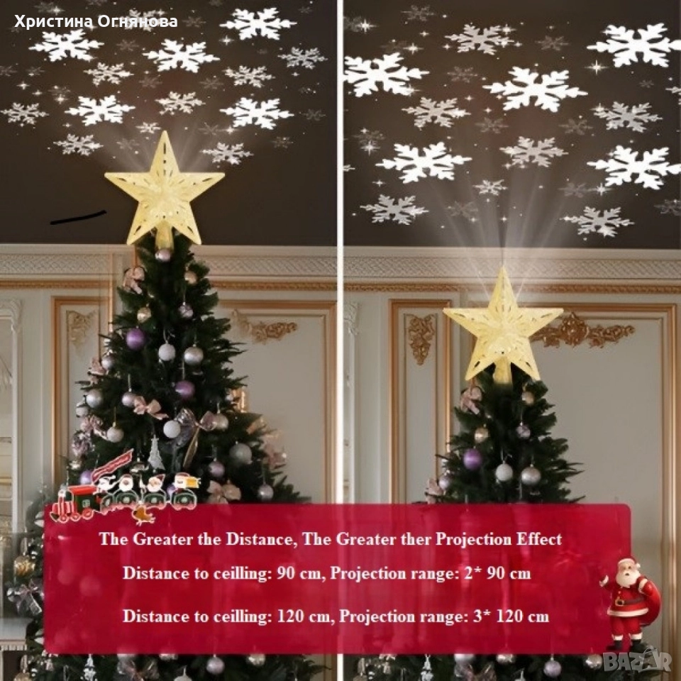 Описание на продукта Създайте магическа атмосфера с анимирани 3D проекции, които „танцуват“ над вашата елха. Превключвайте между снежинки, Дядо Коледа, чорапчета и други мотиви с помощта на сменяеми филми за прожекция. Регулируемият ъгъл и позициониране ви дават контрол върху ширината и мястото на изображението. С обхват 2,5 × 2,9 × 0,6 m и дълъг кабел продуктът е подходящ за повечето коледни дръвчета за вътрешна употреба. Изработен от лек PVC, работи чрез стандартен електрически контакт и не съдържа вредни вещества. Спецификация на продукта: Материал: лек PVC Размери: 9 × 19,5 × 25 cm, тегло: 0,45 kg Захранване: стандартен EU щепсел, метод на зареждане Съвместимост: подходящ за повечето коледни елхи Друго: 1 филм за прожекция, дължина на кабела 3 m
