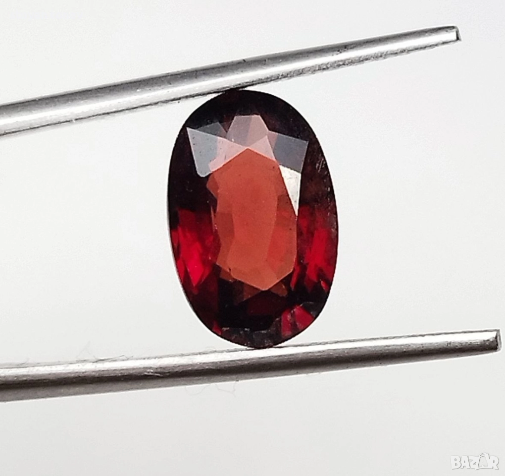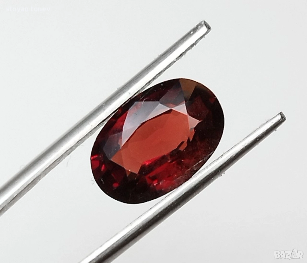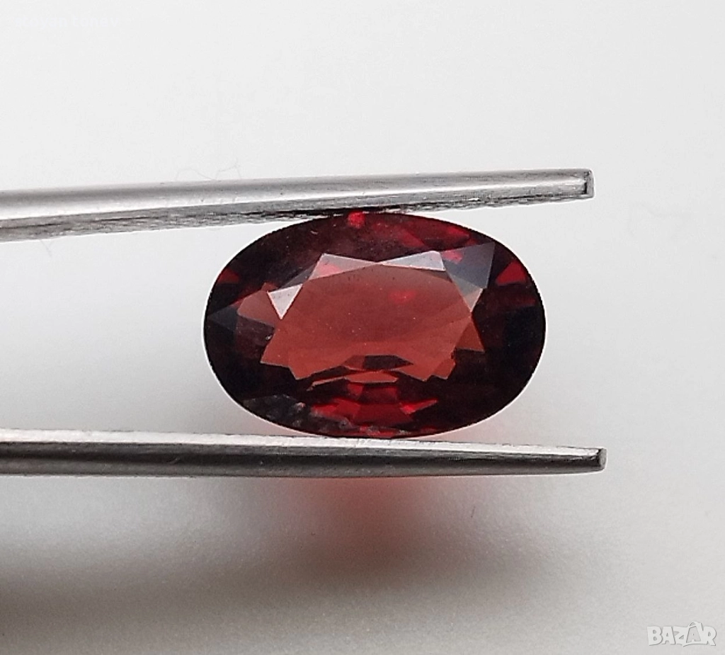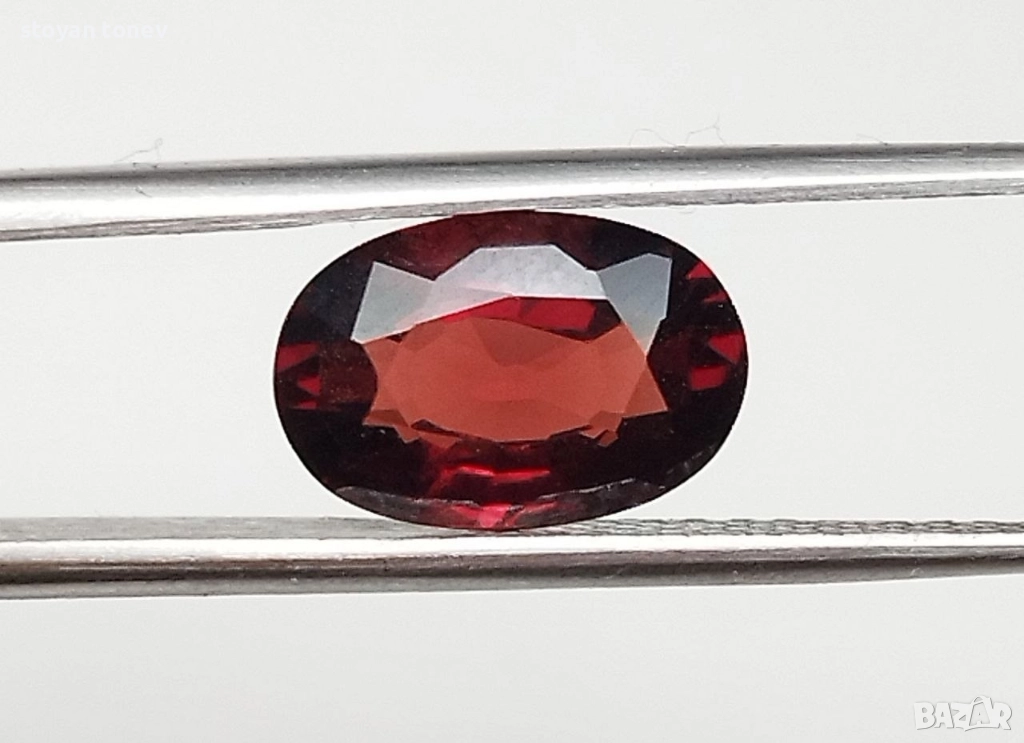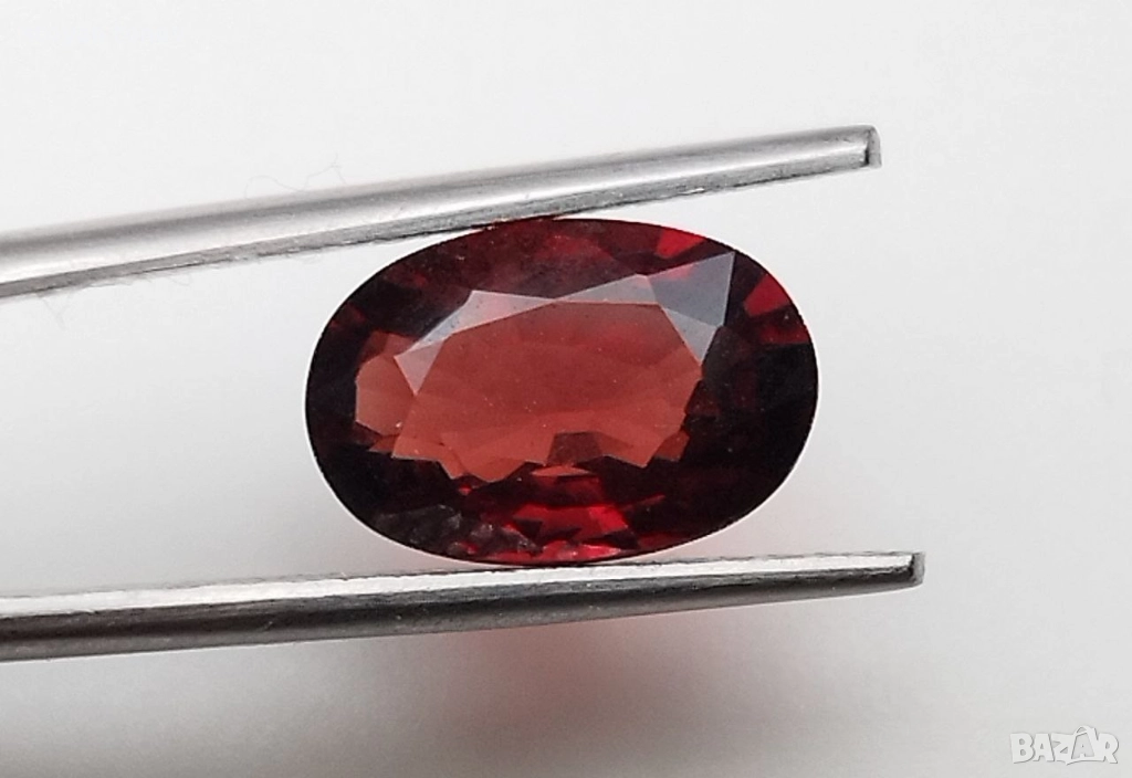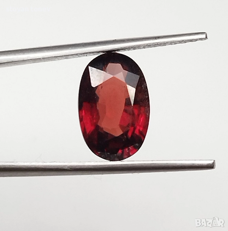 с без видими включения. Цвета е червен. Формата е класически овал с размери: 8.80 x 5.99 x 3.75 mm.