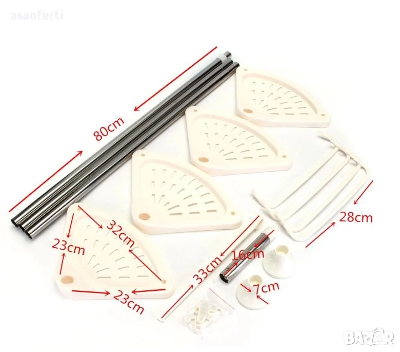 Размери на Рафтовете: Приблизително 23 см x 23 см по дължина на страните, които лягат в ъгъла.