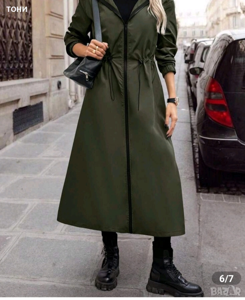 Дамският тренчкот в цвят маслина е водоустойчив и подходящ за дъждовни дни.
