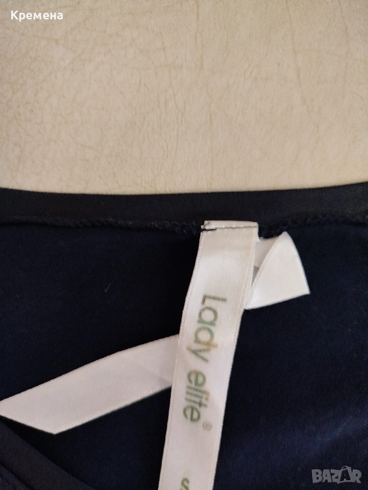 Блуза на марката Lady Elite ,реглан ръкав,тъмносиня с камъни,материята е еластично трико комбинация с имитация на кожа(пак фин плат),дължина на блузата 65см,,ширина 50см