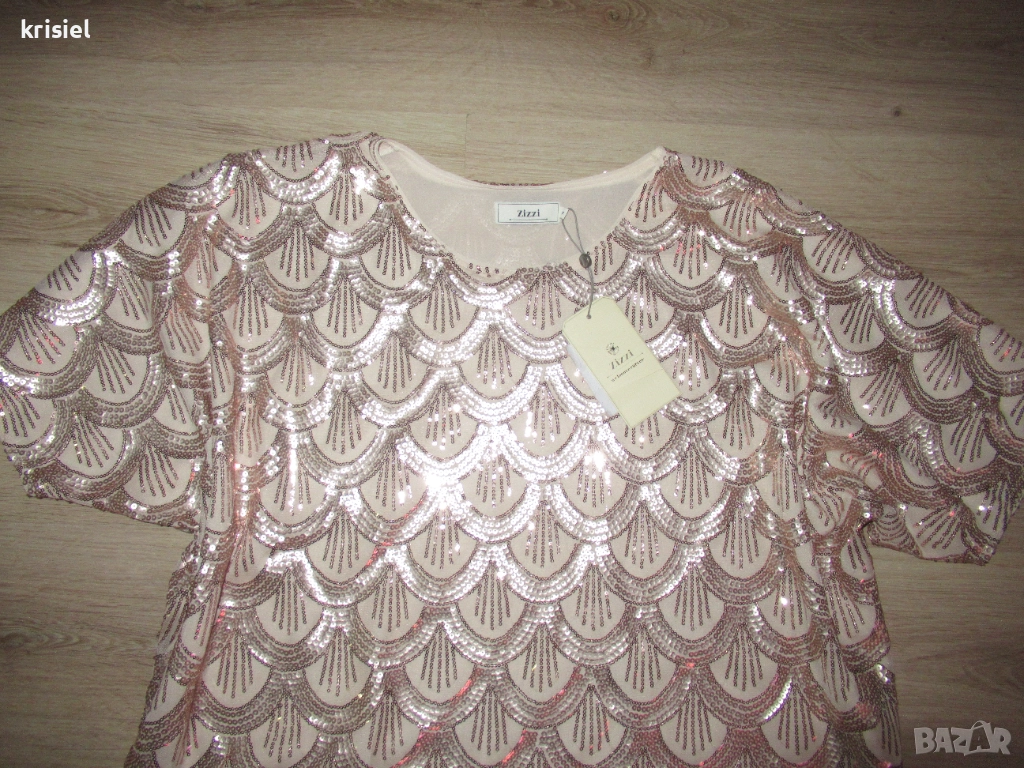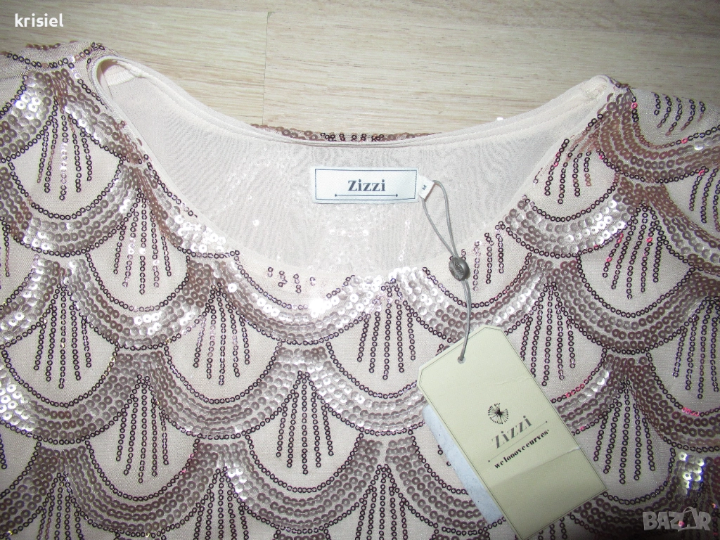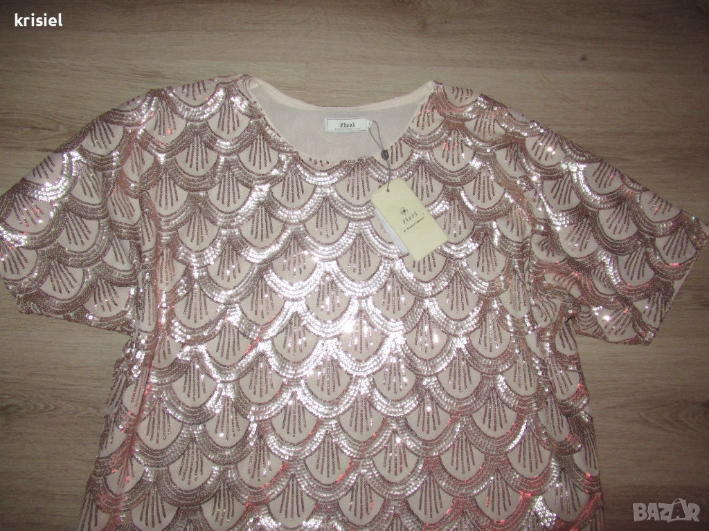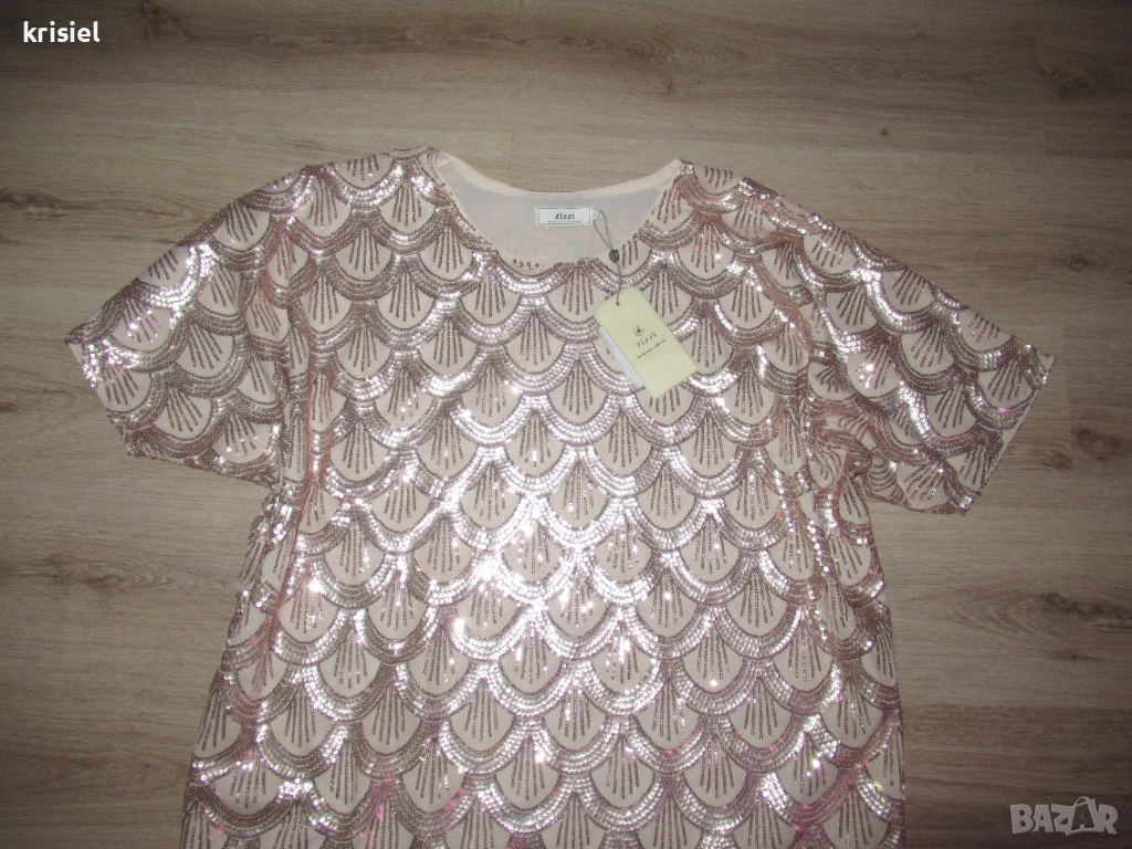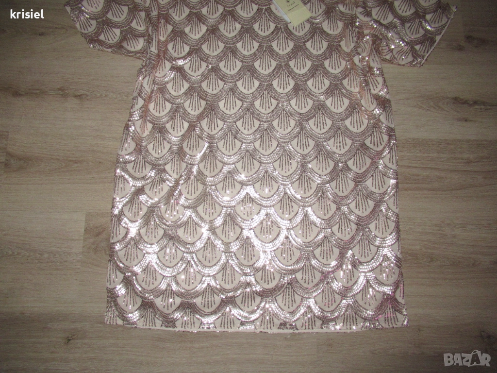 Роклята е нова,с етикет.Номер XL.Много красив и елегантен модел.Официална рокля,подходяща за повод и за идващите празници.Цялата обшита в розово-златни пайетки.Мека и еластична материя.Размерите са:дължина-99см,гръдна-75см,ханш-66см