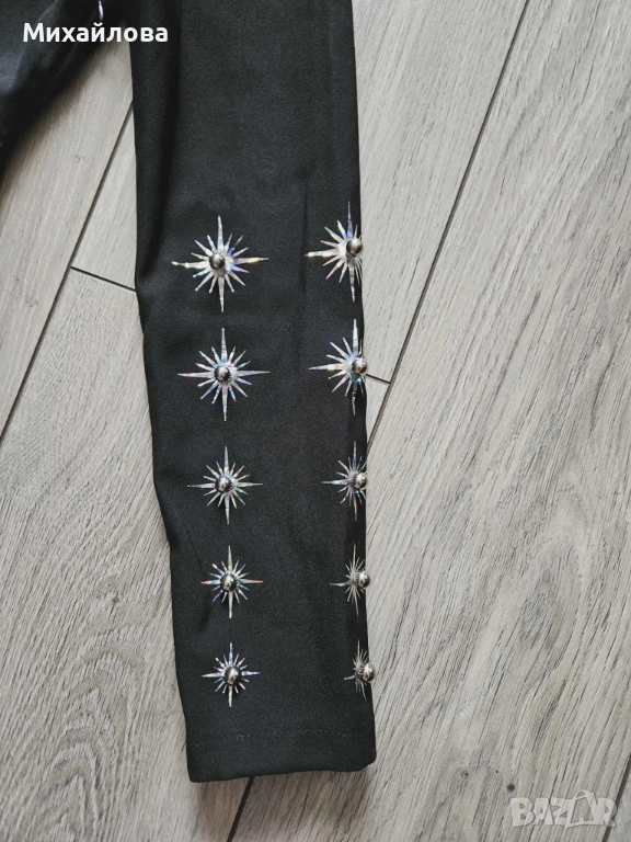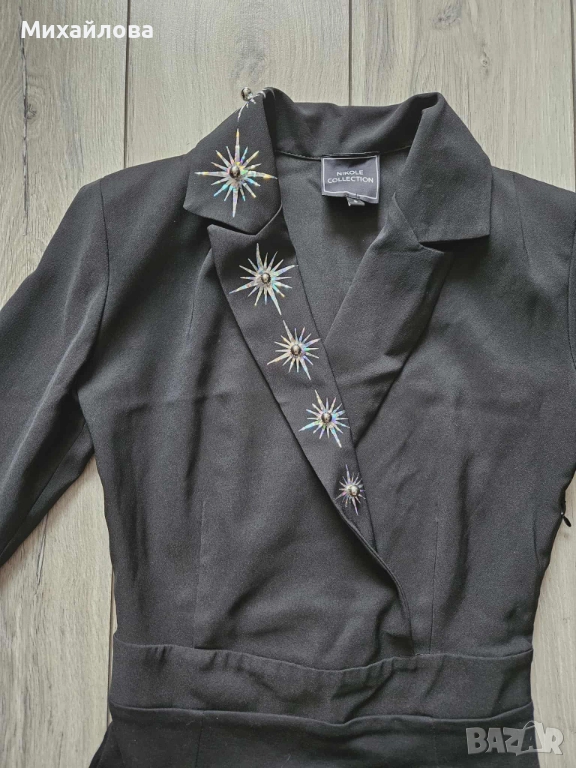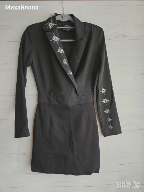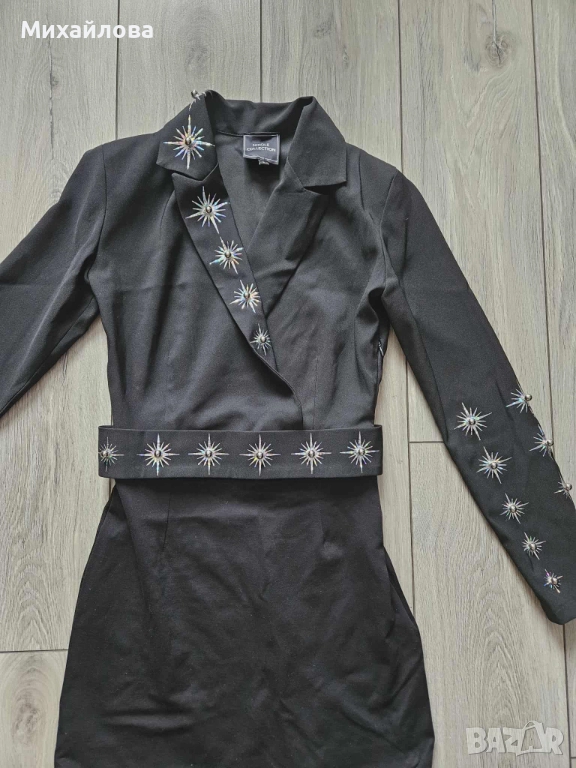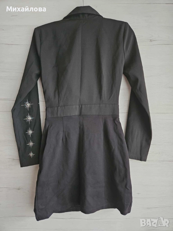 Модерна и стилна рокля в черно, с кройка тип сако. Отличава се с впечатляващи метални апликации във формата на звезди, разположени по реверите, ръкавите и колана. Материята е стегната, гладка и подчертава силуета. Моделът е подходящ за вечерни събития, партита и специални поводи. Състояние: много добро, без забележки