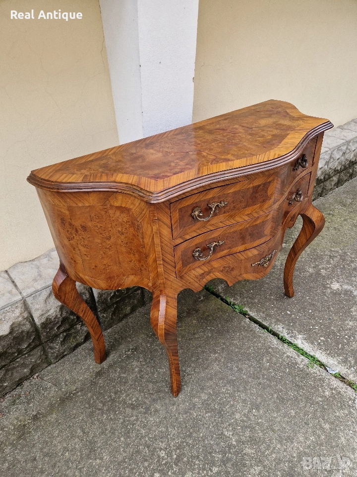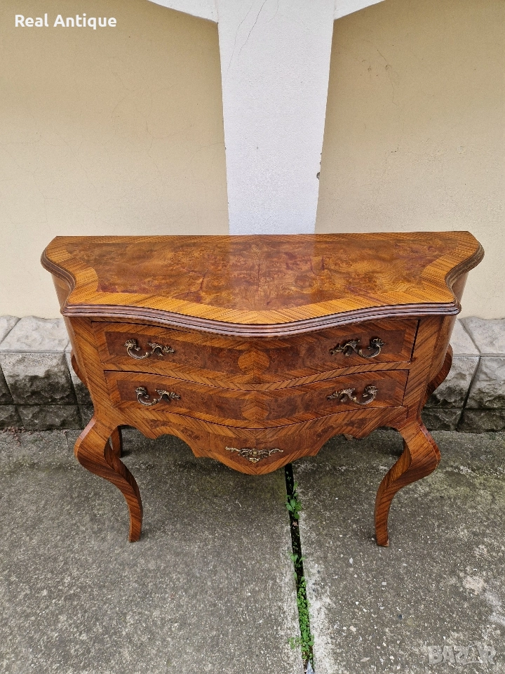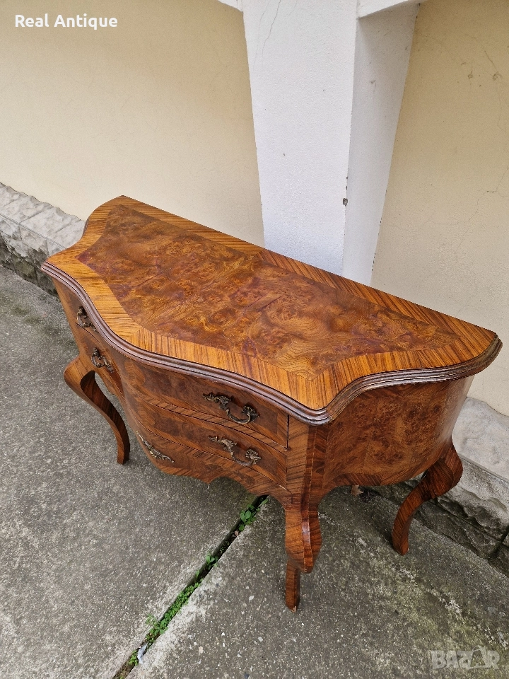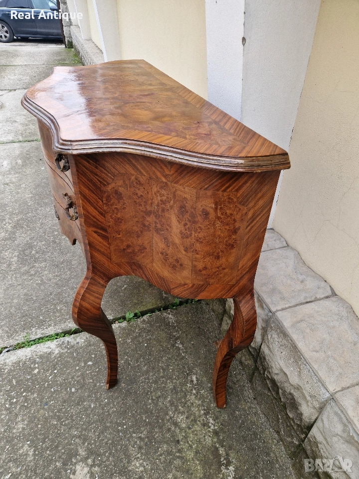 Продавам прекрасен антикварен френски скрин шкаф масив с интарзия в стил Луй 15 в много добро състояние с малки драскотини по плота. Размери дължина 120 см височина 90 см и ширина 50 см. Чудесно допълнение към интериора на Вашия дом офис вила ресторант хотел . Работя с всички куриери. Отговарям бързо.
