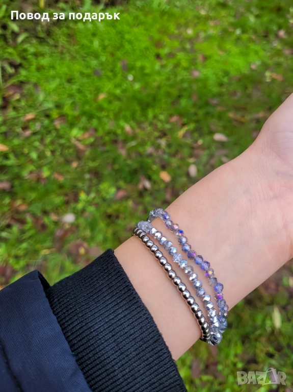 ✨ Две гривни от фасетирани кристални мъниста с нежен, преливащ блясък и висулка от неръждаема стомана за акцент.
