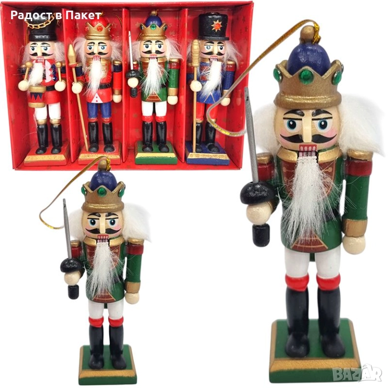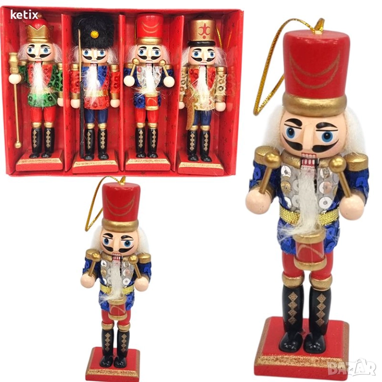 Класически комплект от 4 дървени фигурки Лешникотрошач, високи 13 см. Богатите цветове и фино изработените детайли създават усещане за традиция и празнична атмосфера. Идеални за колекция или стилна коледна декорация.