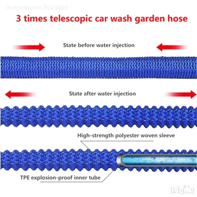 30-метров разтегателен маркуч с пистолет – идеален за поливане и миене Искате маркуч, който да е едновременно здрав, лек и удобен? Този разтягащ се маркуч се удължава до 30 метра, когато отворите водата, и се прибира автоматично след това. Забравете за досадните пречупвания – той не се заплита и не се усуква, дори при дългосрочна употреба. Снабден с професионален метален пистолет с бърз конектор и устойчиви месингови съединения, този комплект е създаден да издържи. Подходящ за всякакви задачи – от поливане на цветя до измиване на градина, кола или фасада. Материали: TPE, полиестер, месинг, метал Дължина: от 10 до 30 метра Пистолет: 24 см, мощна струя и устойчиво тяло Комплектът включва: 1 × Разтегателен маркуч (7.5 – 22.5 м реална дължина) 1 × Метален пистолет с бърз конектор