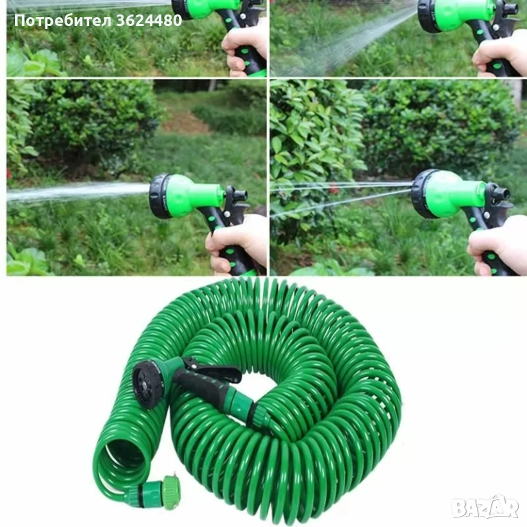 Представяме ви спираловидния градински маркуч, който се разтяга до 20 метра, без да се усуква, прегъва или заплита. Благодарение на спираловидния си дизайн, той автоматично се прибира след всяко използване и заема минимално място при съхранение.