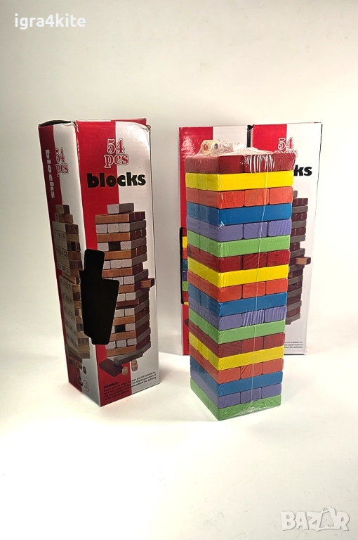 Дървена игра дженга с цветни блокчета, боядисани и лакирани без да цапат ръцете.