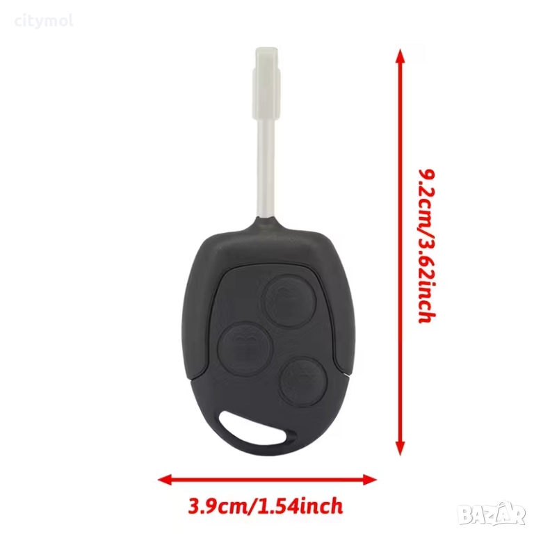 Автомобилен ключ за Ford пълен комплект. Комплектът включва: пластмасова кутийка с 3 бутона за контрол на дистанционните функции + нова ненарязана механична част с профил на перото FO21 + платка за дистанционното с транспондер (чип) .