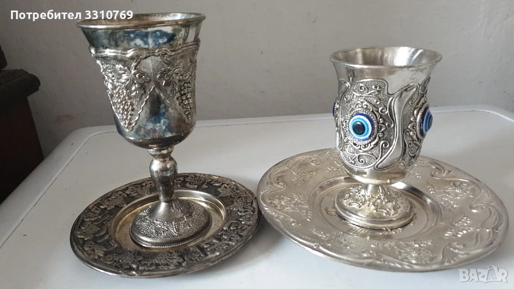Бохемия." Чаша2-кристал,Н=10см.,О=0,2л.Ц=30лв.Бохемия . Чаша3-кристал,Н=9,5см., О=0,2л.Ц=30лв.Бохемия.Чаша 4-стъкло,ръчно изработена и рисувана с надпис, ритуална, Н=24см.,О=0,2л.,Ц=25лв. Чаша5-стъкло,ръчно изработена и рисувана, ритуална, Н=24см.О=0,15см.Ц= 20лв. Чаша 6- синьо стъкло с подложна чиния ,Н=17см.,О=0,2л., Ц=15лв. Чаша 7-бронз,посребрена ,с релефен декор,с подложна чиния, Н=14,5см.,О=0,15л.Ц=25. лв.(два броя-50лв.) Чаша8-бронз,релефна декорация, посребрена с подложна чиния, Н=11,5см.О=0,15л.Ц=30 лв.надписи,Англия.