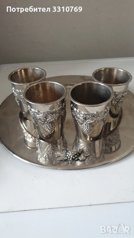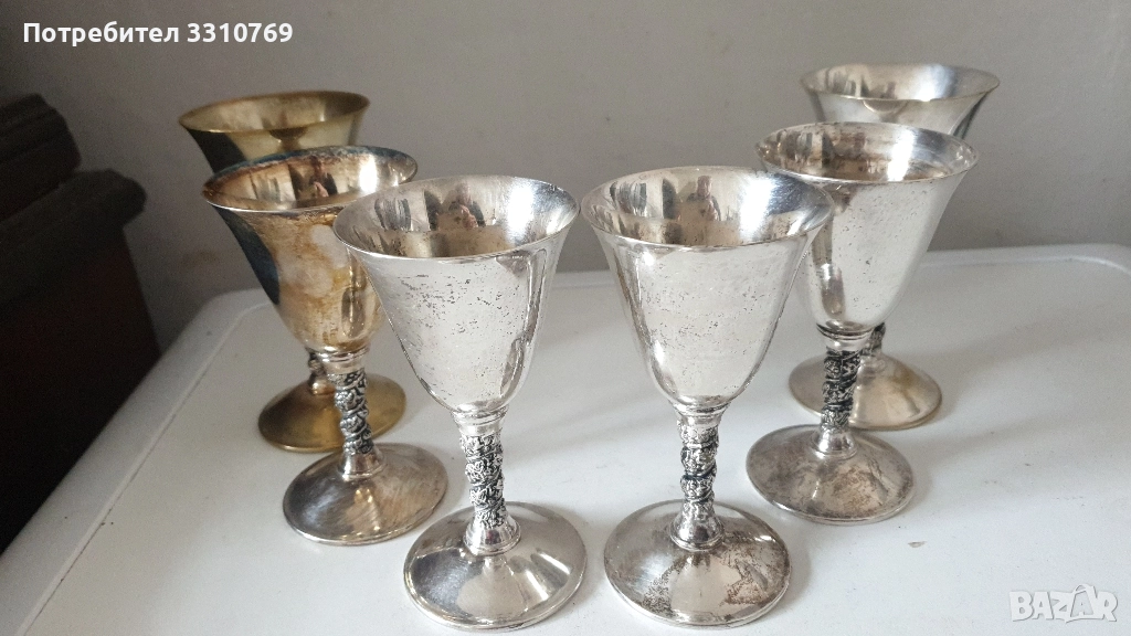 Чаша9- посребрени 6 бр. Н=13см.О=0,1л.,Ц=90лв. печат"Фалстаф"Испания. Чаша 10-посребрени,с релефна декорация, 4 броя,Н=8,5см.,О=0,2л. поднос диаметър 30см. Ц=80лв.,без печат. Чаша11- ликьорни,никелирани и с вътрешна позлата,5 броя