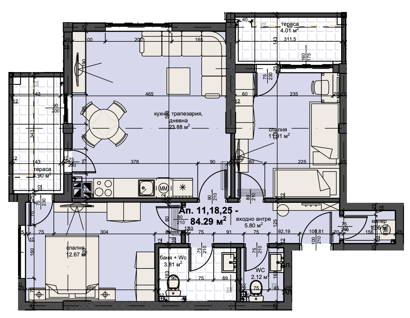 ➡Имотът се състои от антре, баня с тоалетна, отделно тоалетна, килер, 2 спални, дневна с кухня и трапезария, 2 тераси и е с обща площ от 96,69 кв.м.