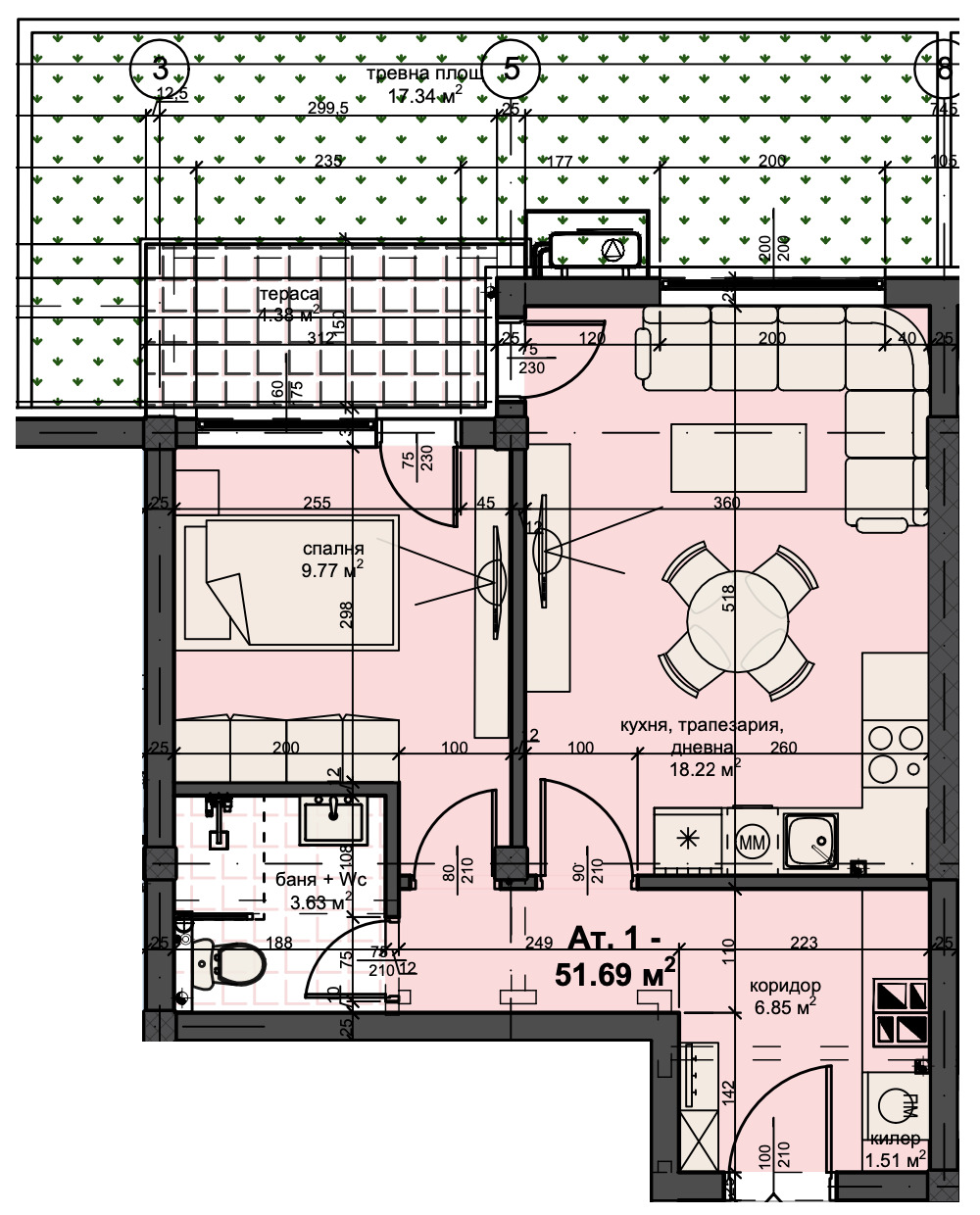 ➡Имотът се състои от антре, баня с тоалетна, килер, спалня, дневна с кухня и трапезария, 2 тераси и е с обща площ от 59,29 кв.м. Към имота има и дворно пространство - 17,34 кв.м.