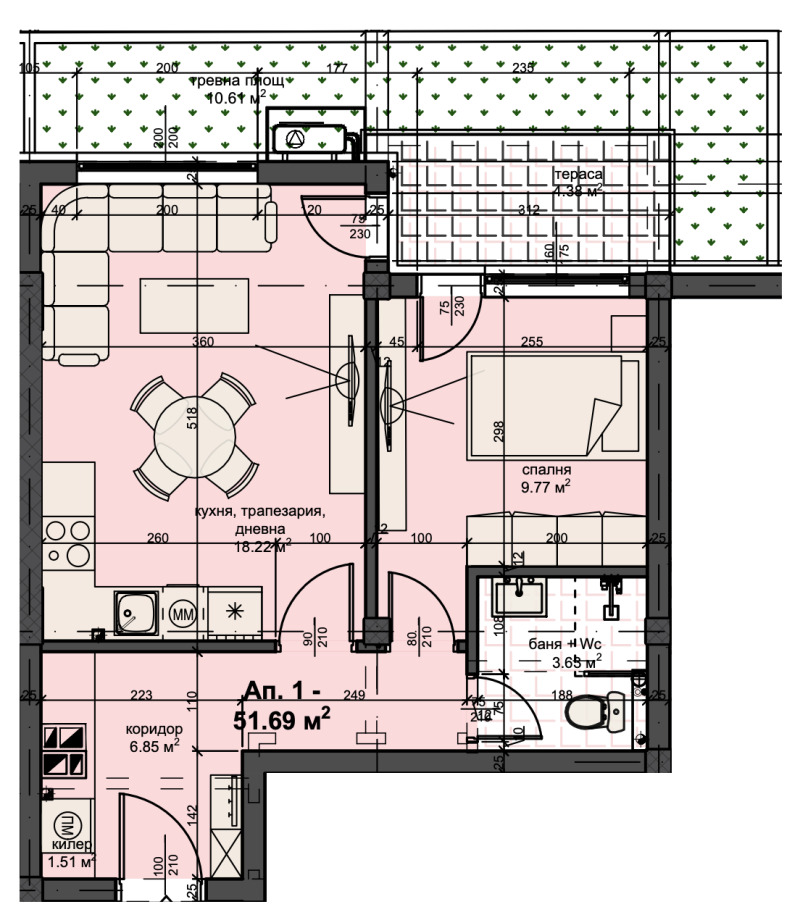 ➡Имотът се състои от антре, баня с тоалетна, килер, спалня, дневна с кухня и трапезария, 2 тераси и е с обща площ от 59,29 кв.м. Към имота има и дворно пространство - 10,61 кв.м.