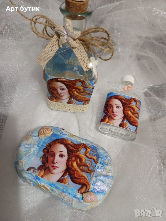 Изработвам комплекти по творби на известни художници. Модел „Раждането на Венера“ с подаръци за гости голяма или малка мидена черупка и Папка за църковно свидетелство, Кутия за аксесоари, църковна свещ , 2 броя . шише за миро , поставка за сапунче