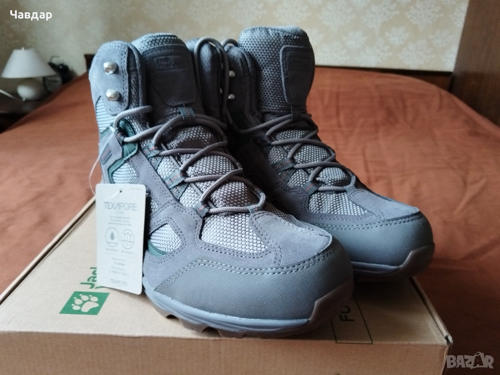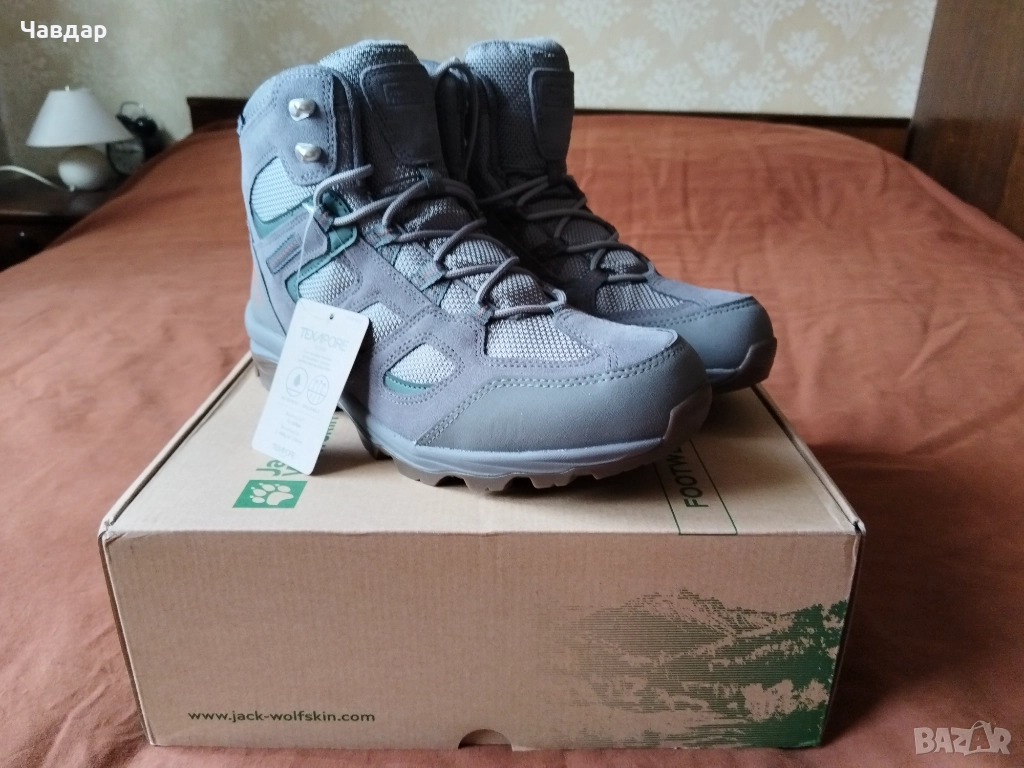 Туристически обувки Jack Wolfskin Vojo 3 Texapore Mid M. Размер по етикет - 44, измерена стелка - 29 см. Цвят - сив. Материал - естествен велур и текстил (тип кордура). Мембрана TEXAPORE CORE - водоустойчивост 10 000 мм., дишаща 3 400 гр./кв.м./24 часа. Подходящи за туризъм и ежедневно ползване. Състояние - НОВИ с ЕТИКЕТ, в оригинална кутия. Цена - 80 евро.