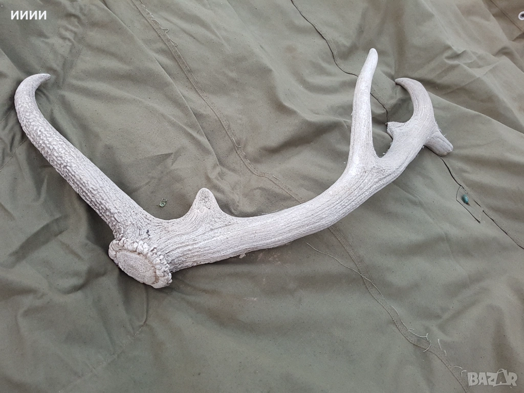 Дебел масивен рог, 2 от връхчетата му се отчупени, вероятно от битките на елена, особено подходящ е за дръжки на ножове.