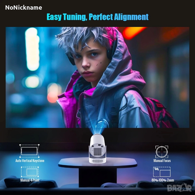 • Лесно настройване, перфектно подравняване: Автоматично вертикално трапецовидно изкривяване и ръчно 4-точково и ръчно фокусиране и 80%-100% увеличение