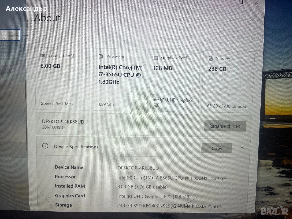 Лаптоп + оригинален 65W адаптер: 339 лв