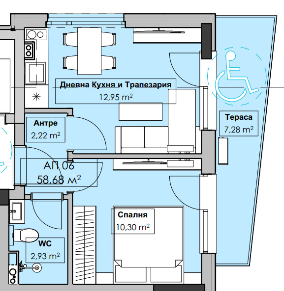 Предлаганият от нас апартамент е ситуиран на 3-ти жилищен етаж и разполага с площ от 58,37 кв.м разгърнати в следното практично разпределение: хол с кухня и трапезария, спалня, баня с тоалетна, тераса.