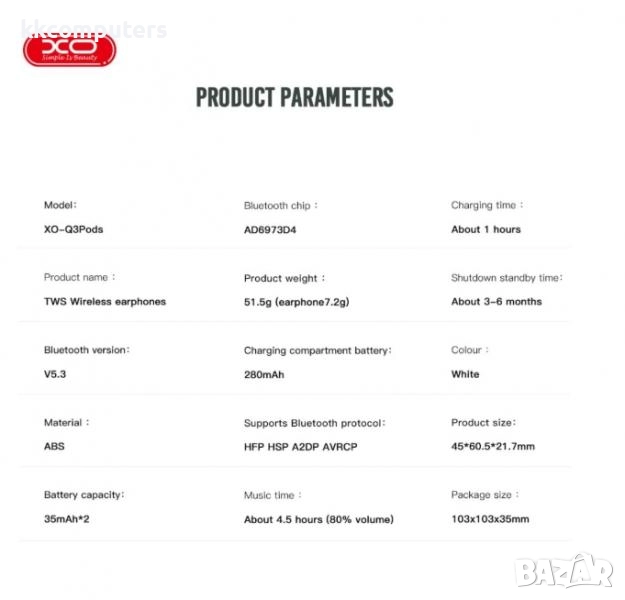 Bluetooth Handsfree Wireless XO-Q3 Pods /Бял/ Баркод : 2404149, снимка 1 - Bluetooth слушалки - 52651249 Bluetooth Handsfree Wireless XO-Q3 Pods /Бял/ Баркод : 2404149, снимка 2 - Bluetooth слушалки - 52651249 Bluetooth Handsfree Wireless XO-Q3 Pods /Бял/ Баркод : 2404149, снимка 3 - Bluetooth слушалки - 52651249 1/3