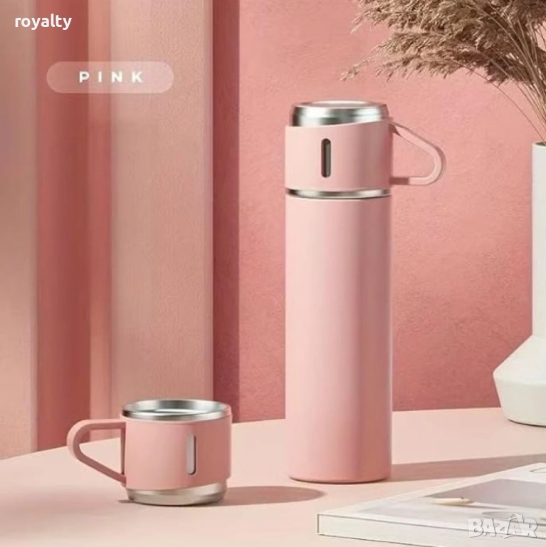 Подаръчен комплект термос с 3 чаши, зелен, розов, сив