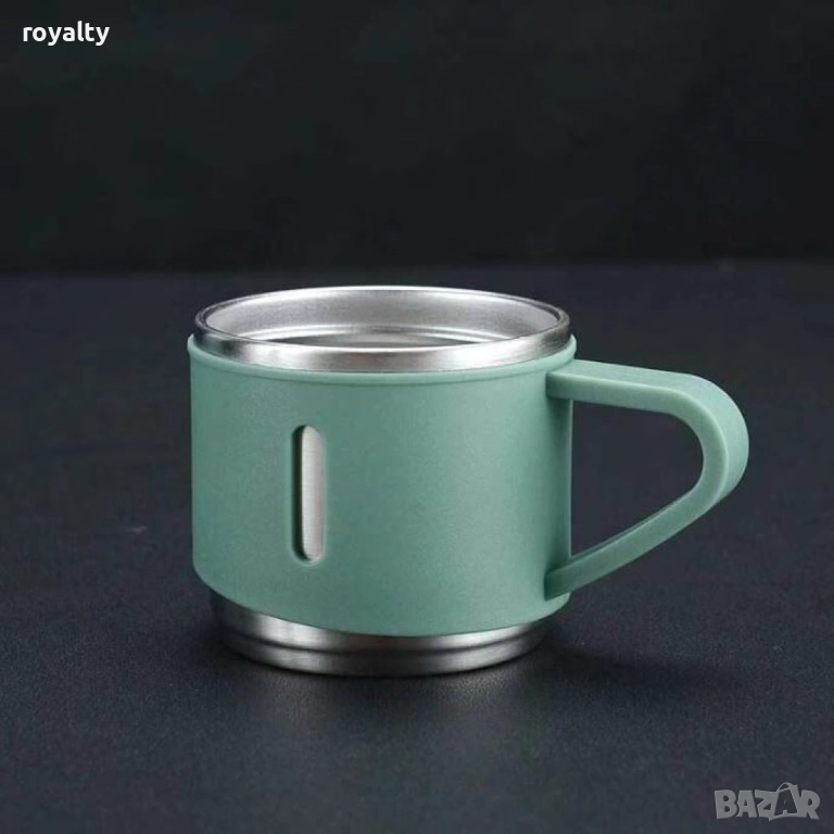 Обем на термоса: 500 ml; Обем на чашите: 150 ml всяка; Материал: Неръждаема стомана; Изолация: Двойна стена; Трайност на изолацията: До 12 часа; Брой части в комплекта: 4 (1 термос и 3 чаши); Цветове: Зелен, розов, сив.