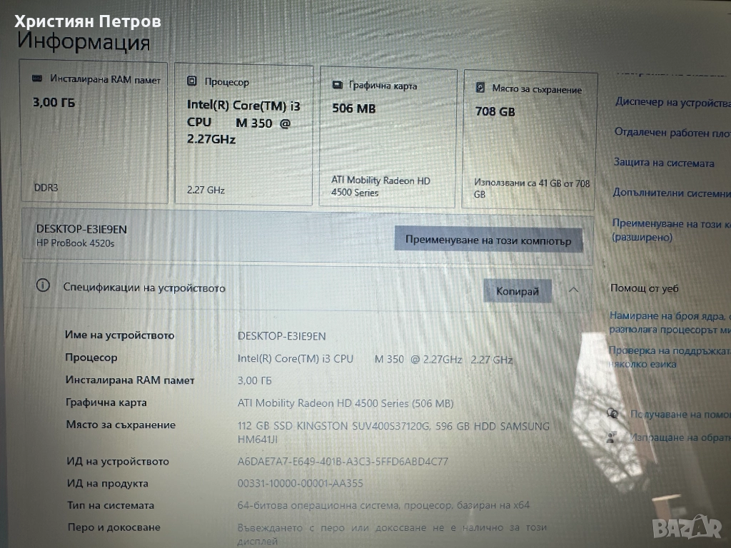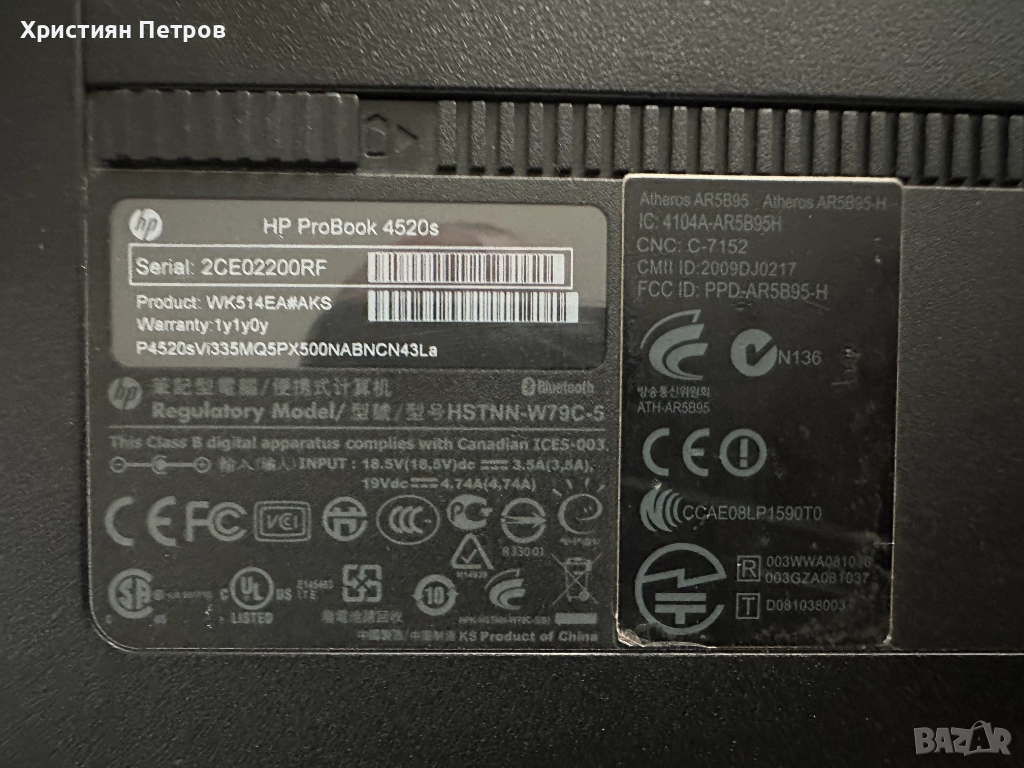 Продавам HP ProBook 4520s в отлично състояние със следните параметри: