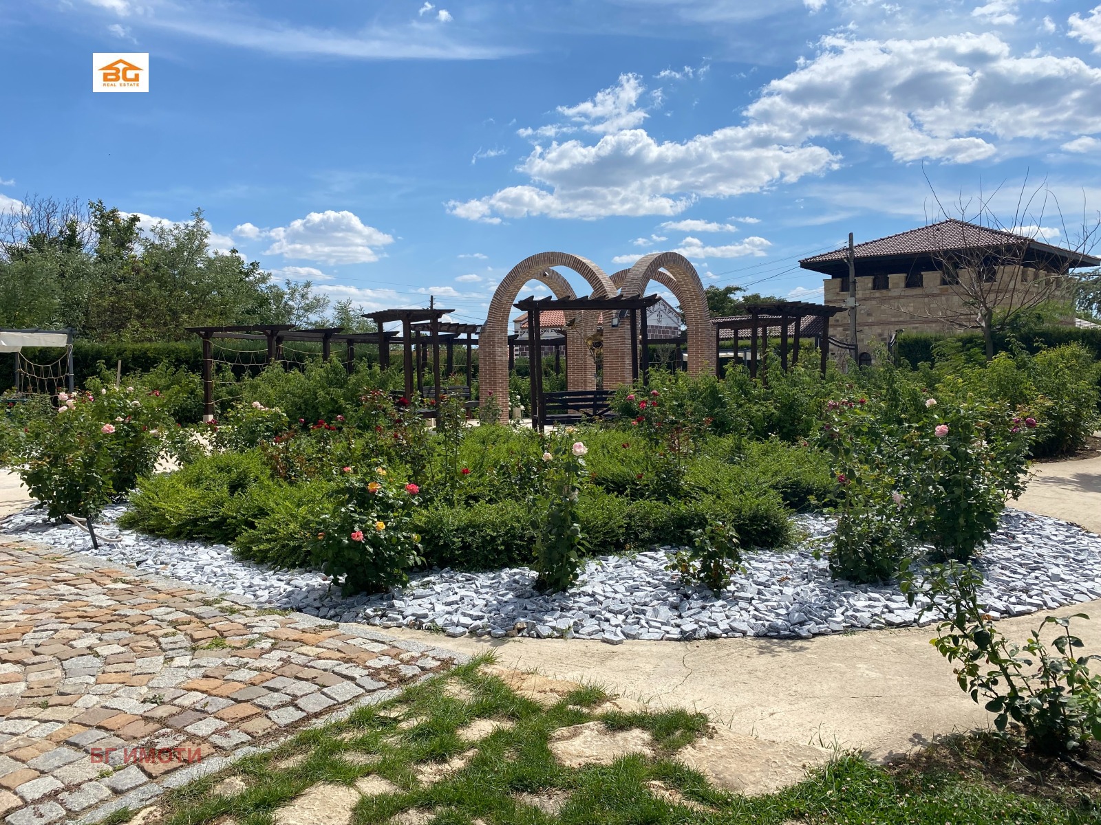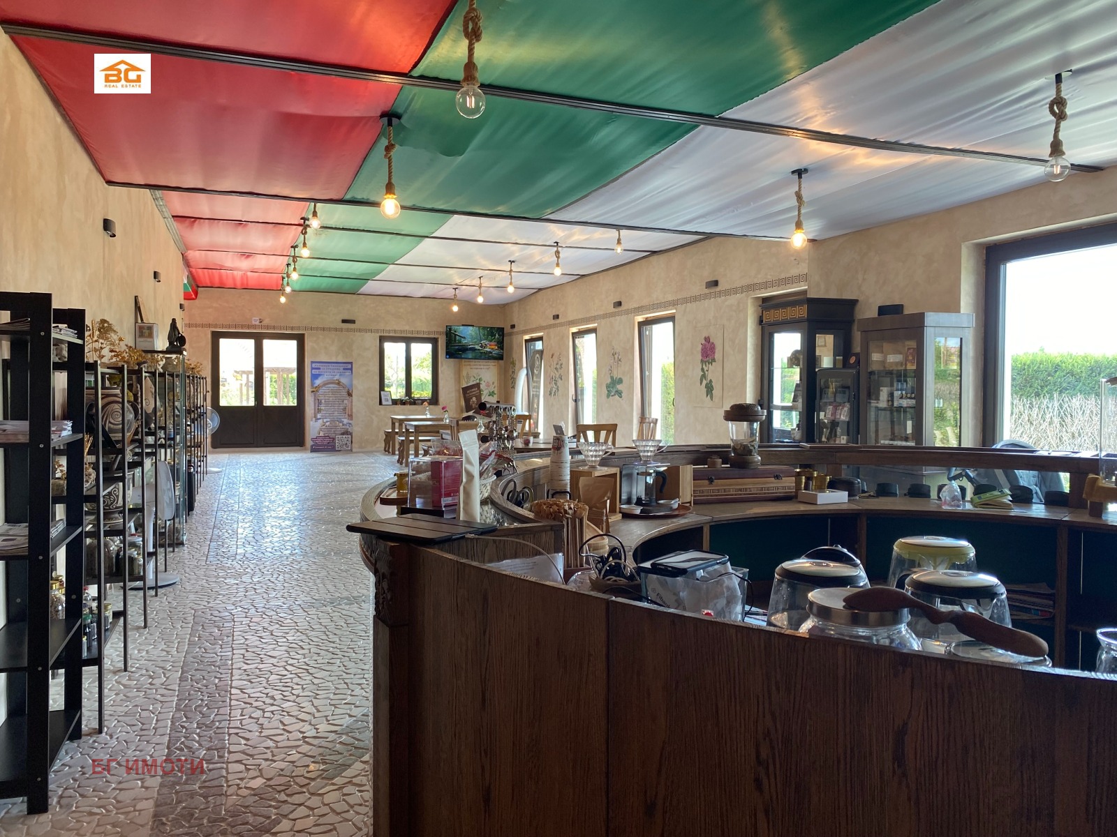 Многофункционална сграда с площ от 532 кв.м от който 332 кв.м партерно ниво и таван със същата площ, от които около 200 кв.м използваеми * Разпределение: Живуща част със сервизно помещение * Работилница * Сервизно помещение за бойлер, ел. табло, табло за термопомпа, табло за пречиствателна станция и видеонаблюдение * Изложбена зала за посетители * Малък склад със служебна баня и тоалетна * Три обществени тоалетни. Двор 4,5 декара изключително интересно оформен. Таванския етаж е възможност за обособяване на стаи за гости.