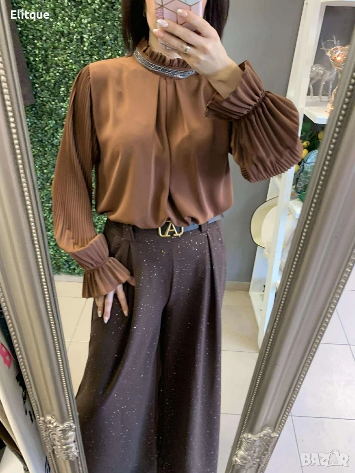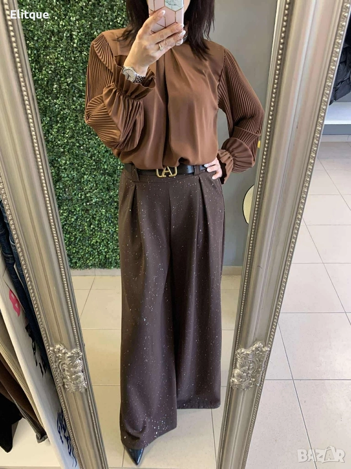 🤎Елегантна риза с камъни на деколтето и ръкави Солей 🤎Стандарт , от С до М 🤎 55лв 🤎Панталон с брокатени частици и колан 🤎 Стандарт , подходящ от С до Л/ХЛ - 🤎55лв