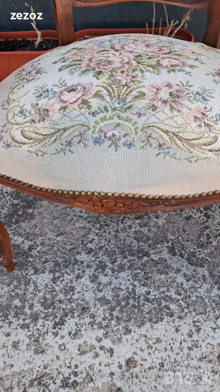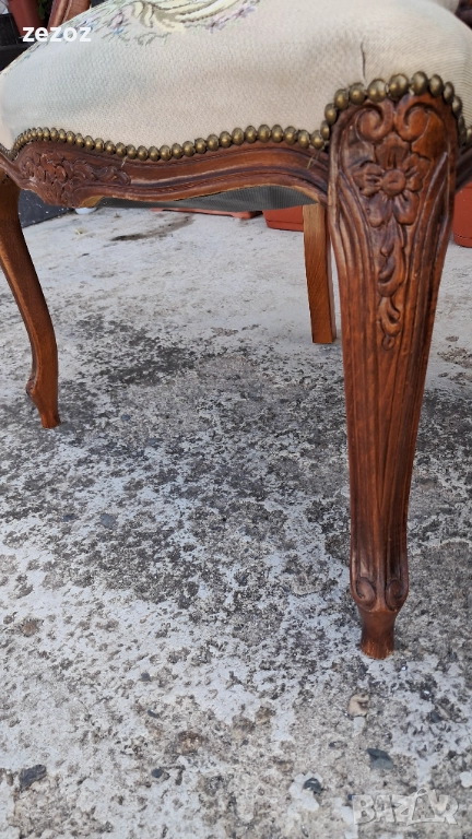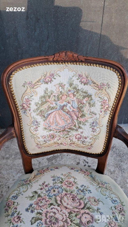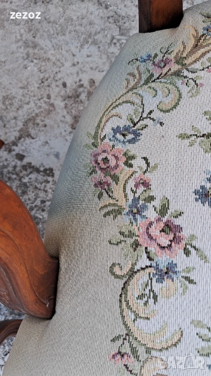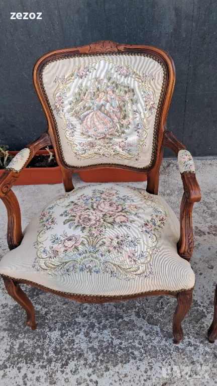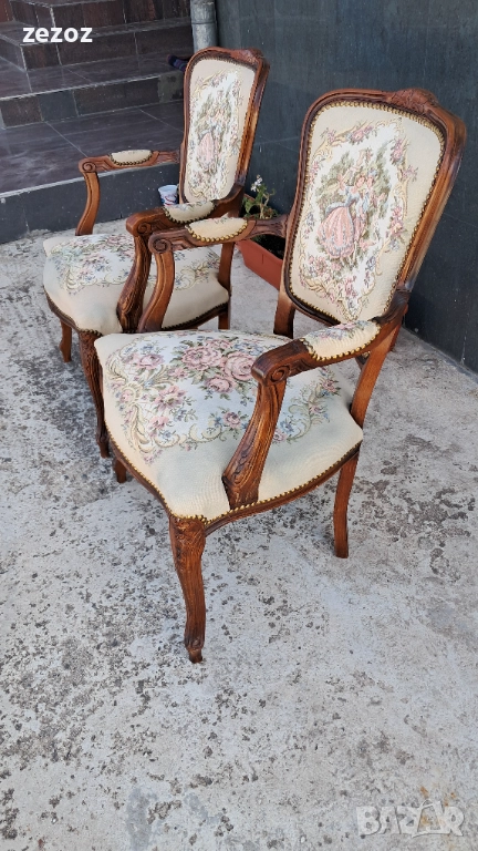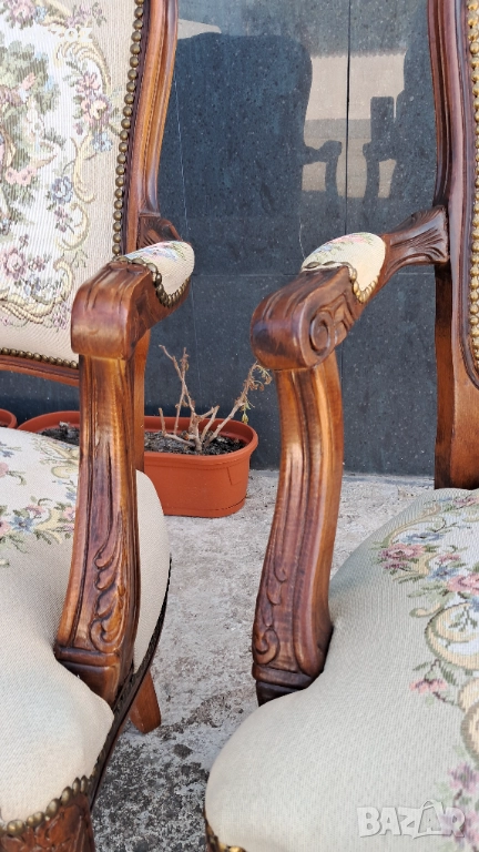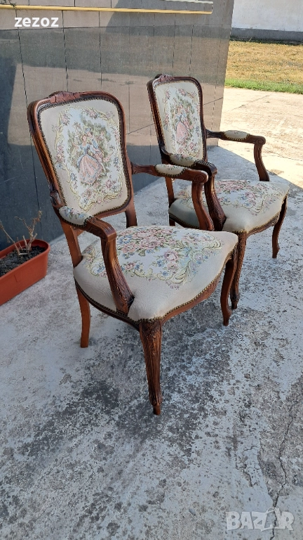 Цената е за комплект 2 бр. еднакви.Ретро кресла в бароков стил.Орехов масив. Жакардова дамаска с дама и кавалер на облегалката.Дамаската по седалките е здрава,но има леко синкаво оцветяване,видимо на снимките.Конструктивно здрави и стабилни.Размери-