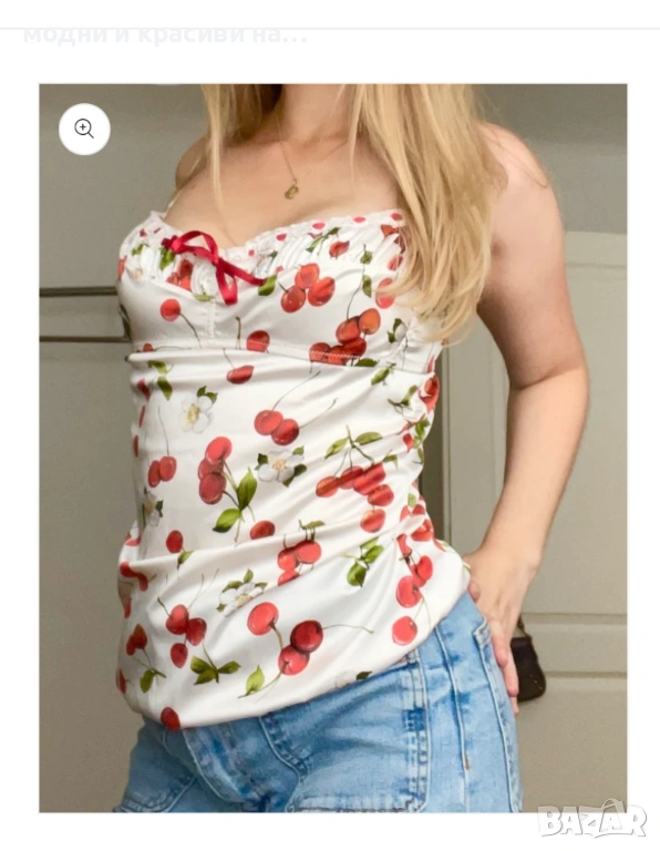 Красиво оформено деколте. Червена лента, която следва деколтето и се връзва отпред в красива панделка.