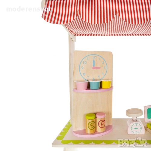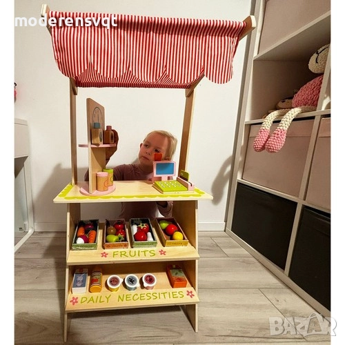 Супермаркет за деца – дървена сергия с касов апарат и комплект плодове