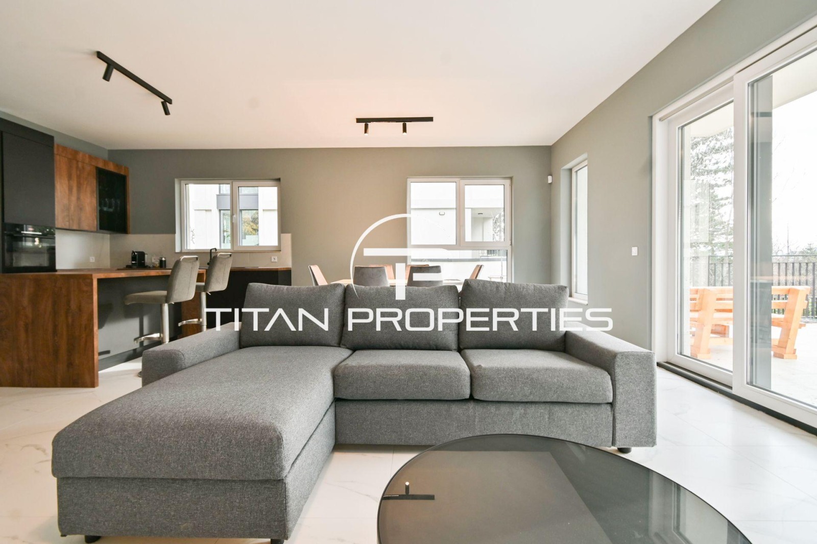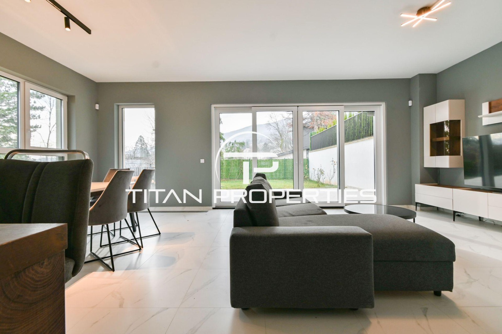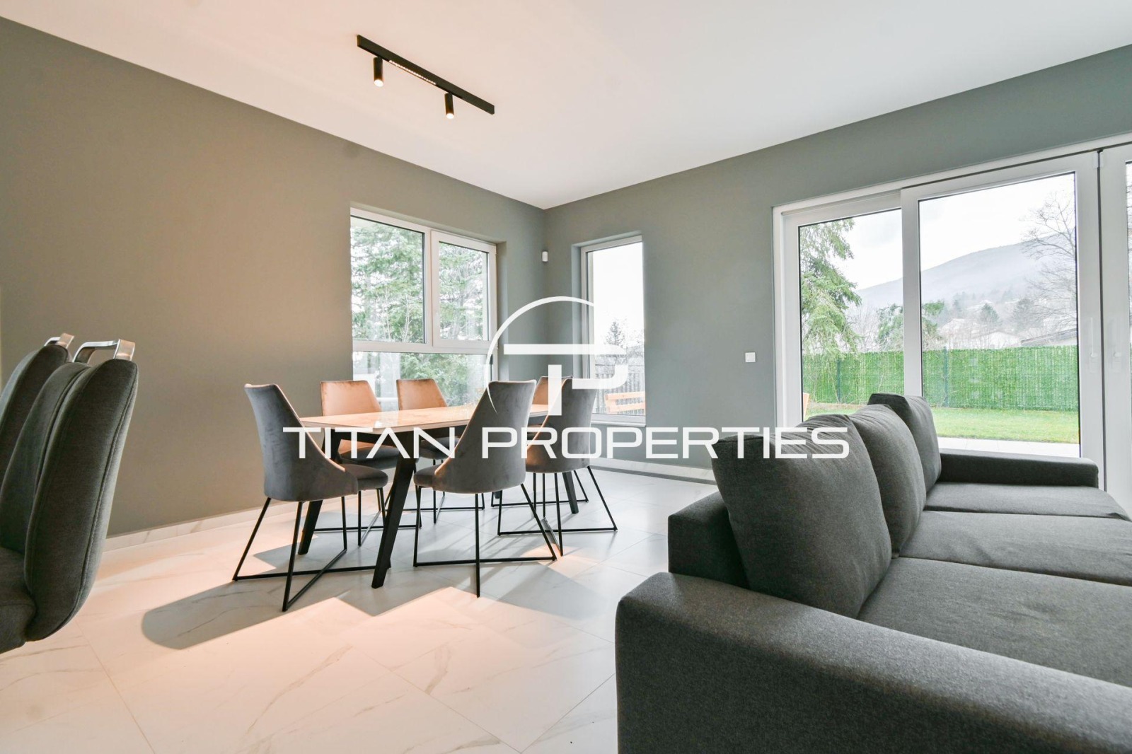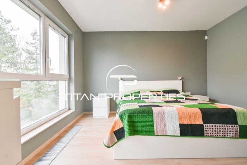 Титан Пропъртис - офис Младост с радост предлага на Вашето внимание луксозна къща под наем в кв. Драгалевци, София с обща площ 400 кв.м. в нова къща. Разпределението включва сутерен: механа, винарна изба, котелно помещение със сензор против наводнение, перално помещение с улей от всички бани, склад с rack шкаф за интернет, СОТ и Smart home система. Партерното ниво включва хол с кухненски бокс и трапезария склад с топла връзка към гаража, веранда, двор и паркомясто. Вторият етаж разполага с три спални с отделни тераси, една със собствена баня и дрешник, както и допълнителна баня и тоалетна. На третия етаж е голяма стая/офис с П-образна тераса и баня с тоалетна. Отопление с термо помпа има опция и на газ. Разполага със системна Smart home за управление и следене на жилището. Къщата се предлага напълно обзаведено с чисто нови мебели и оборудвано с висок клас ел. уреди.