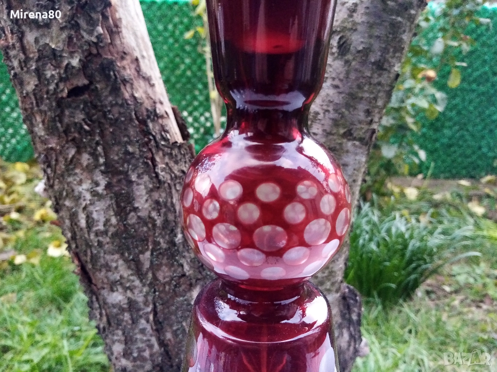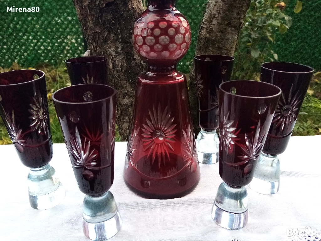 Арт Деко - характерен за формите от този период, в разкошен рубиненочервен цвят. Чешки оловен кристал - тежки и масивни. Гарафа (вмест. 750 мл, вис. 30 см) + 6 чаши (вмест. 120-130 мл, вис. 16, диам. 5 см). Гарафата тежи 1100 гр, а всяка чаша = 230 гр. Богата гравюра, ръчна изработка ! Отлично състояние, едната чаша има лека неравност на ръбчето - според мен фабрична (не е чип) - на посл. снимка.