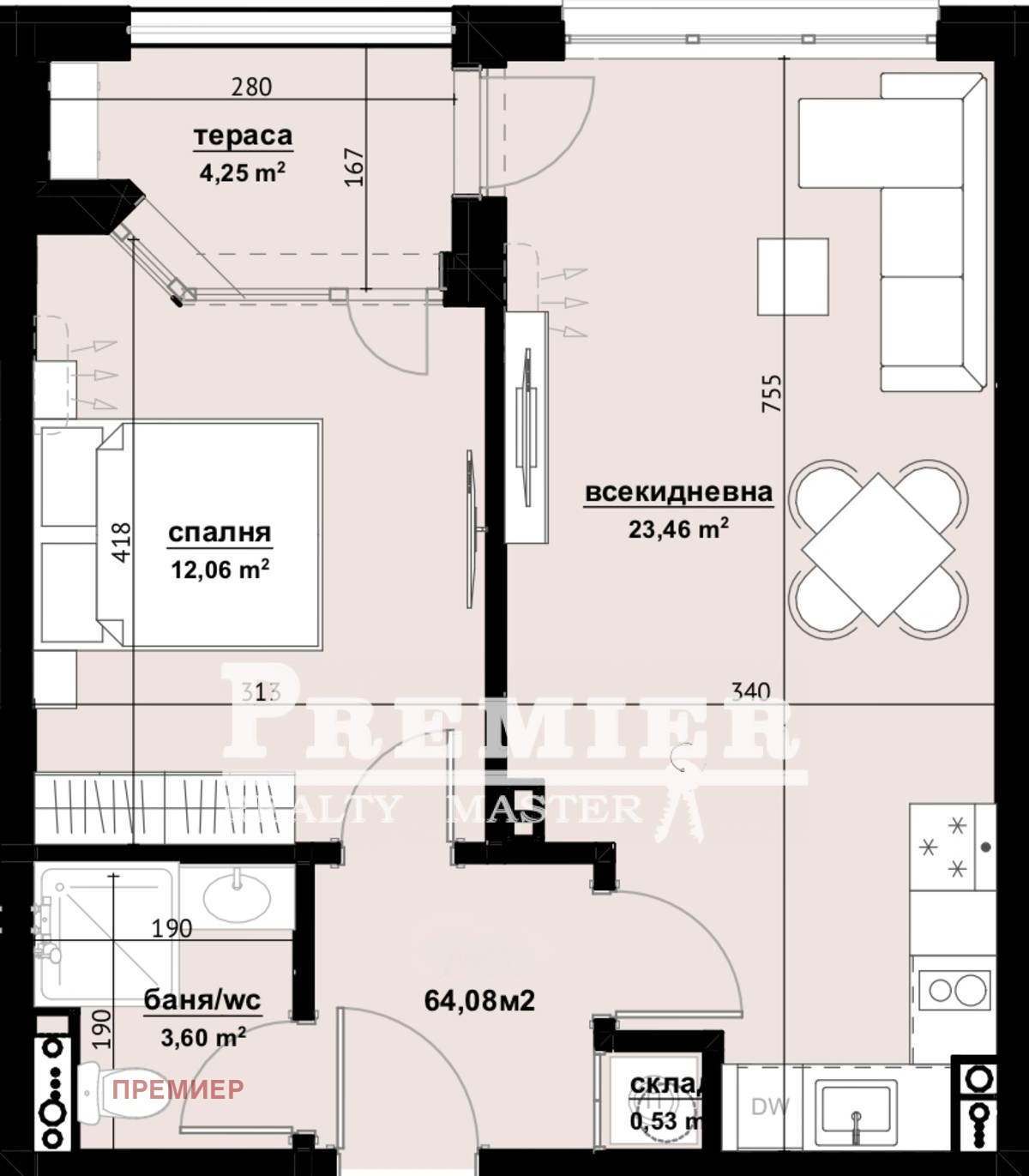 Разпределение: антре, просторна всекидневна, спалня, баня с тоалетна, склад/мокро помещение и тераса.