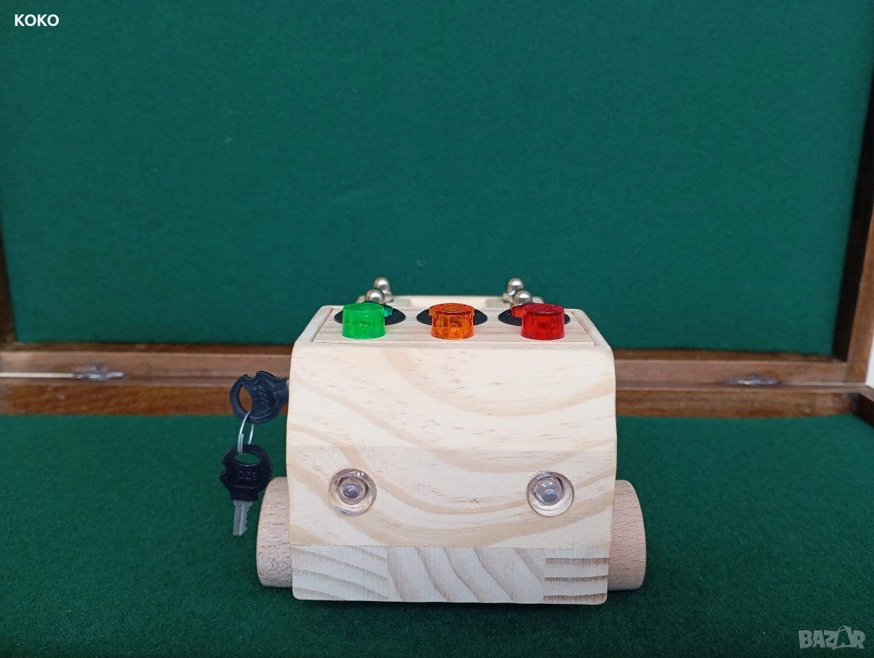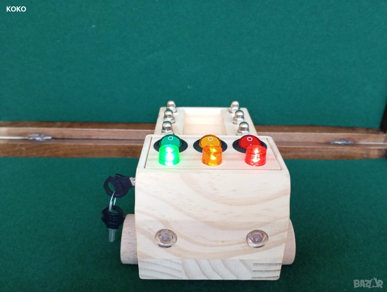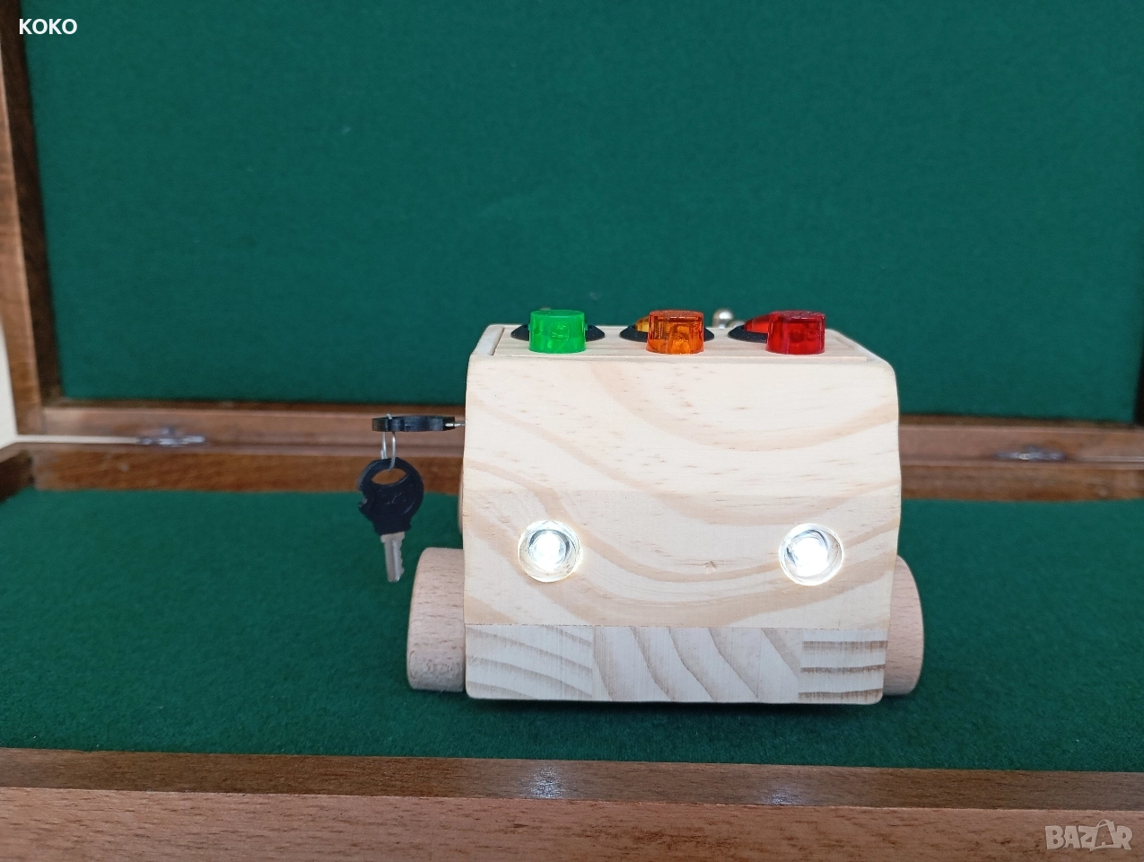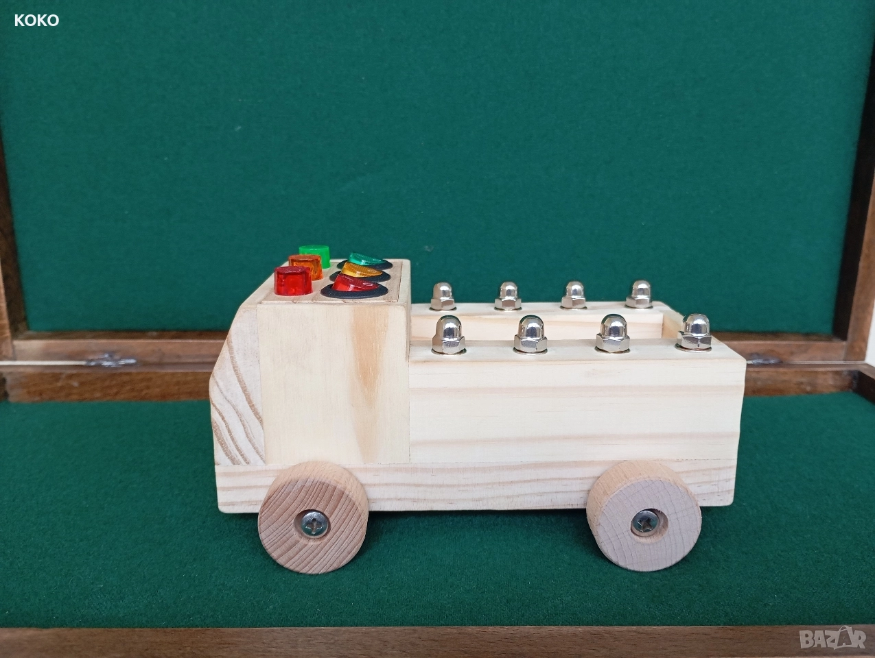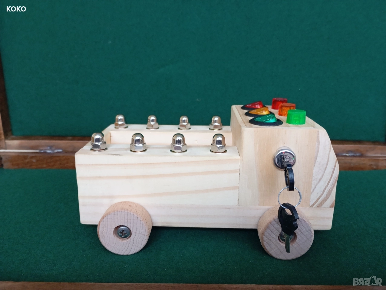 Дървено Камионче със светлини ,бутоните отгоре пускат лампичките ,когато се завърти ключето се пускат фаровете ,и може да се извади ключето и да останат да светят ,гумите се въртят ,има метални гайки на каруцерията ,(запалките в каруцерията са за снимката само като декорация ,не вървят с камиончето )
