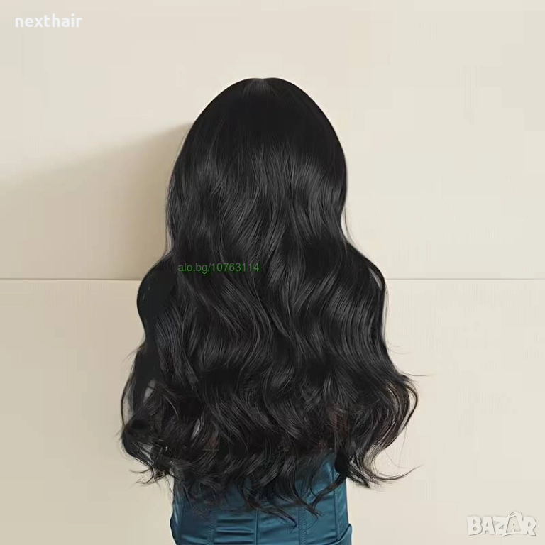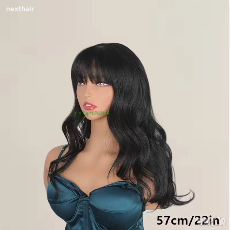 Добавете стил и увереност към визията си с тази елегантна черна синтетична перука. Дължината ѝ от 55-60 см създава впечатляващо излъчване, а фините чупливи вълни придават естествен и обемен вид. Правият, мек бретон допълва формата и подчертава лицето.
