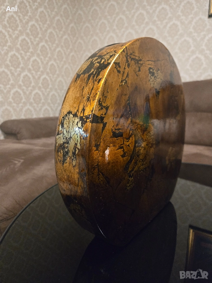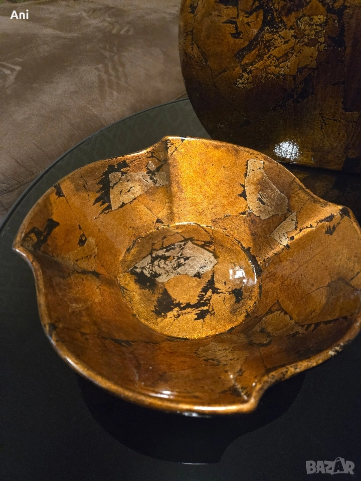 Уникален дизайнерски комплект от ваза + дълбока купа. Уникални форми и цветове. Цвета е меланж между златно, черно кафяво, много леко лъскаво. Без аналог на пазара страхотен единичен модел и последен комплект като наличност.