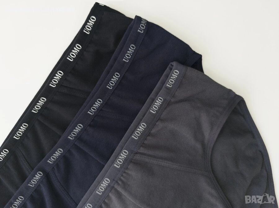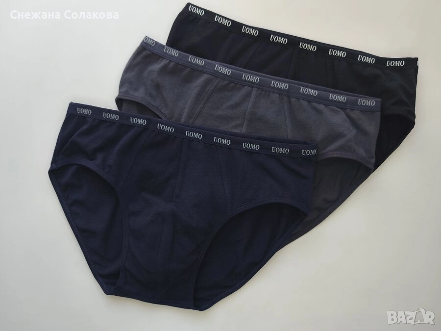 Комплект от 3 броя слипове с тънък и еластичен ластик. Всеки комплект се състои от 3 цвята - черен, тъмносин и тъмносив.