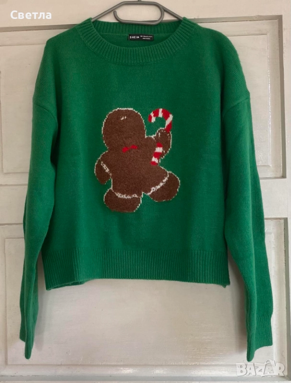 1. Пуловер в зелено с апликация. р-р Дълъг 55 см, ГО 116 см. неопънат;