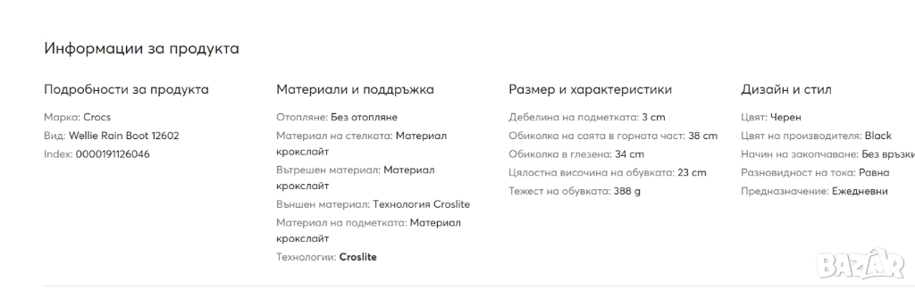 - Материал: Ботушът е изработен от напълно формован материал Croslite, който е водоустойчив до самия си връх.