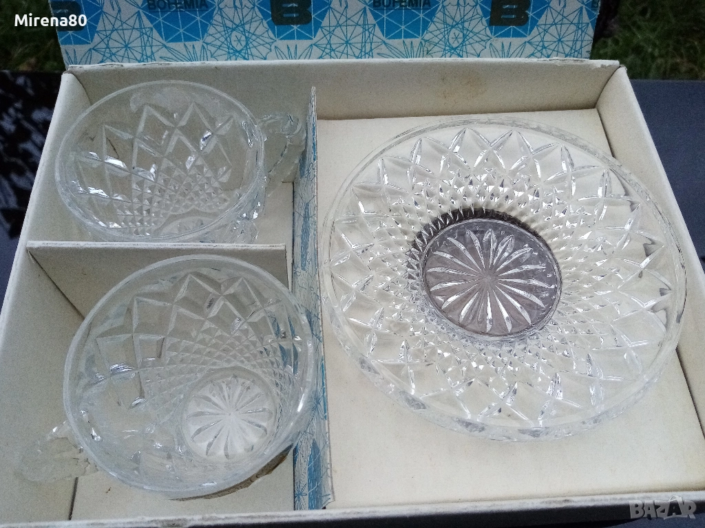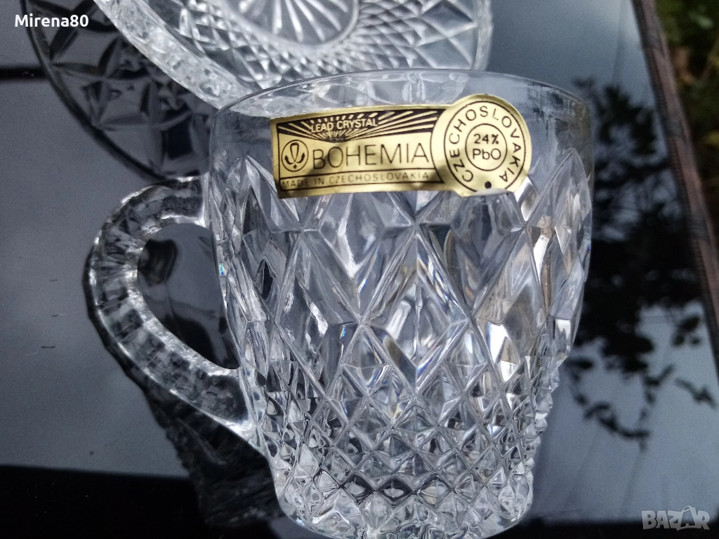 Чехословакия, оловен кристал с отлично качество. Неупотребявани, с оригинална кутия. Атрактивен дизайн с многобройни фасети невероятен блясък. Вмест. 150 мл, диам. чинийка - 13 см. Тегло на един сет - 450 гр.