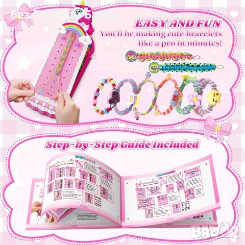 Включва разноцветни конци, мъниста, чармове, стикери и аксесоари за декорация