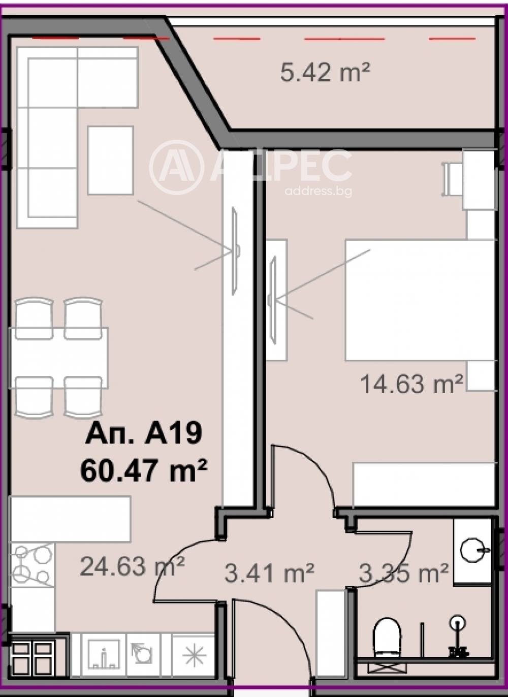 Двустаен апартамент разпределен както следва - антре, дневна с кухненски бокс, спалня, тераса